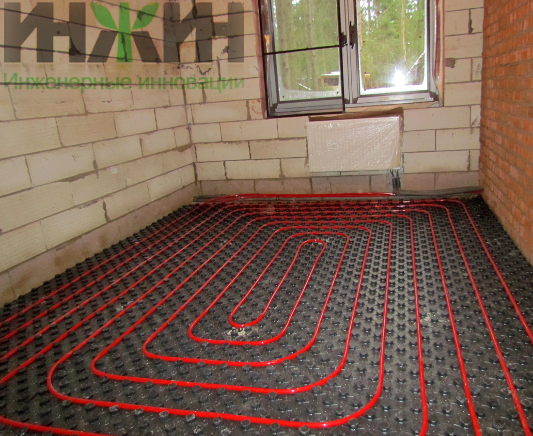 - Монтаж водяного теплого пола выполнен на плитах ENERGOFLOOR PIPELOCK (Энергофлекс) на площади 12 м.кв.;