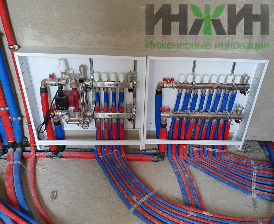 - Смонтировано два распределительных коллектора Valtec на 6 и 8 отводов;