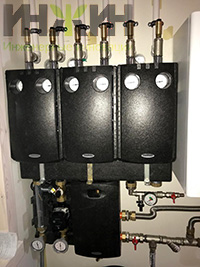 - Монтаж коллектора Meibes с насосными группами и циркуляционными насосами Grundfos (в составе насосных групп);