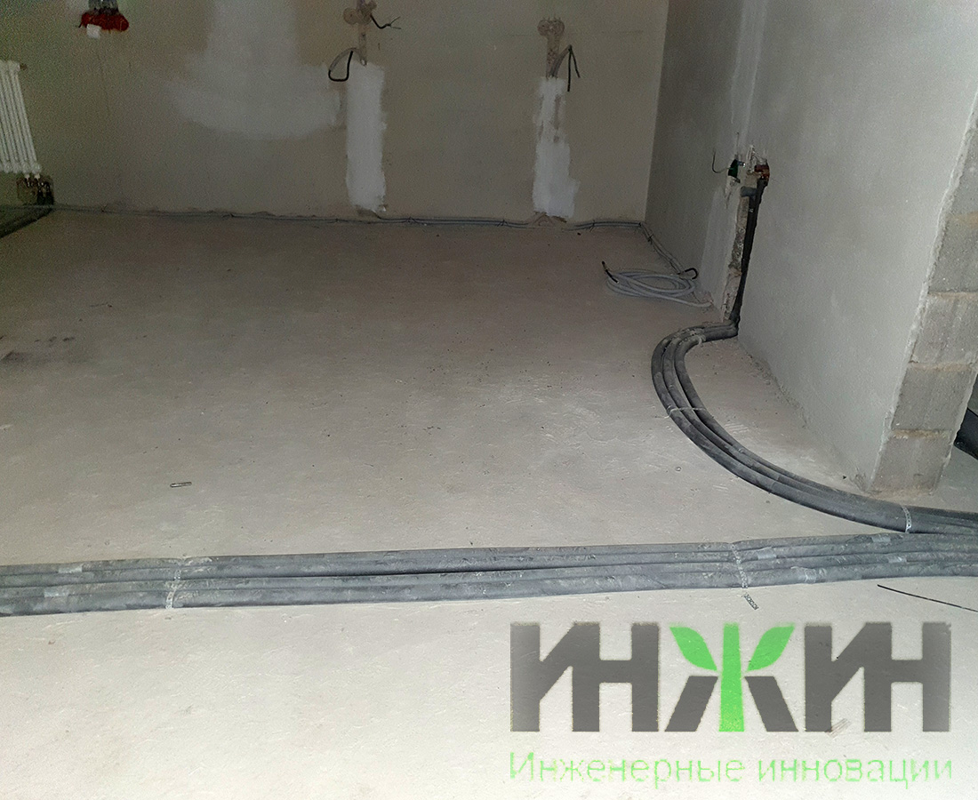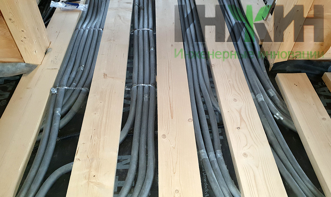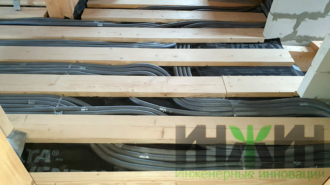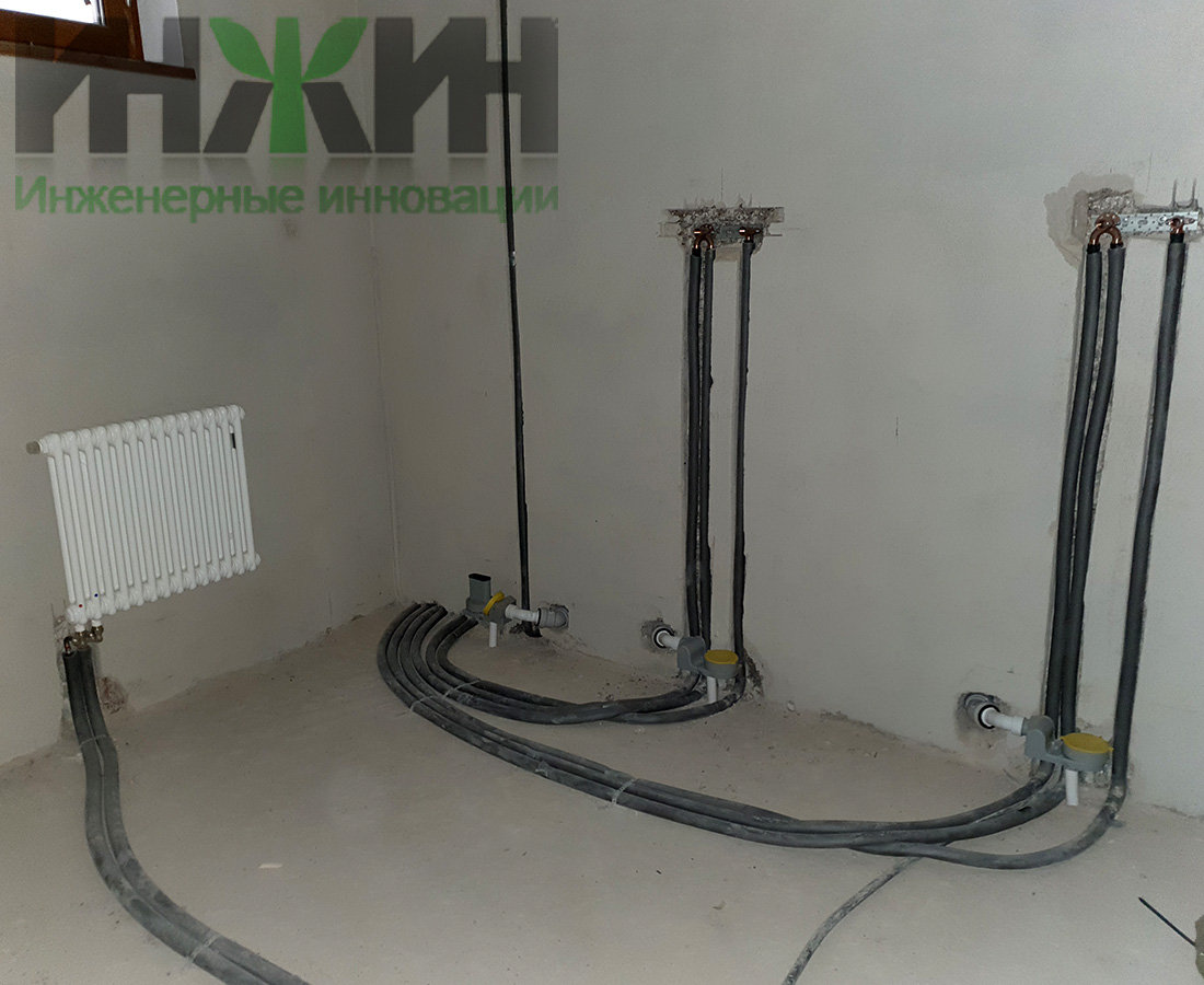 - Монтаж трубопроводов отопления и выполнен скрытым способом, в конструкции деревянного пола (1 и 2 этажа) и в стяжке пола цокольного этажа;