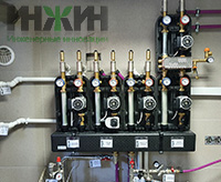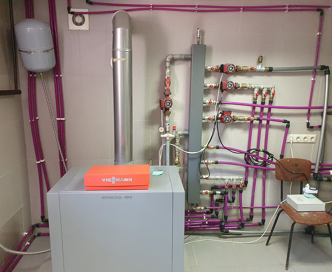 - Гидравлическое подключение газового котла Viessmannмощностью 40 кВт к распределительному коллектору;