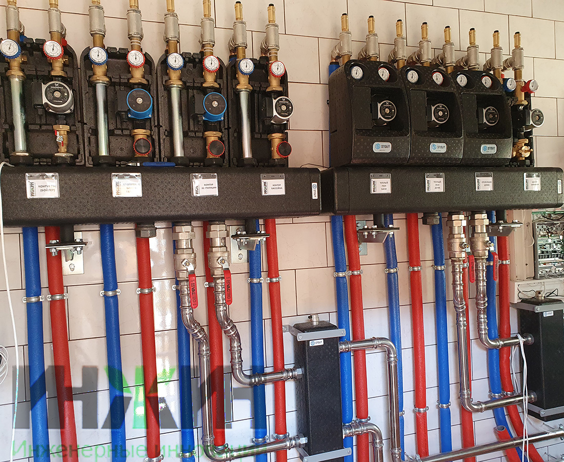 - Монтаж девяти циркуляционных насосов и насоса рециркуляции горячей воды Grundfos и Valtec;
