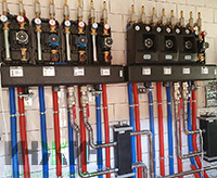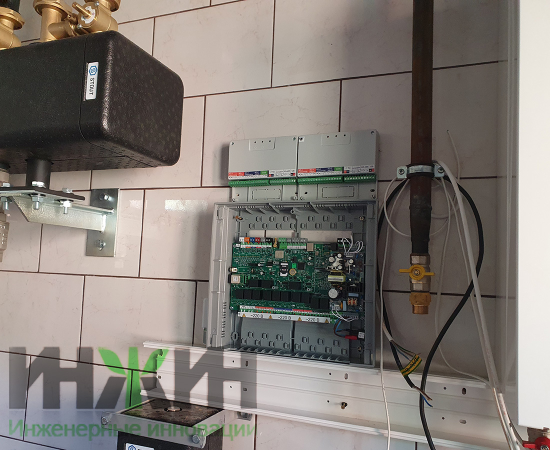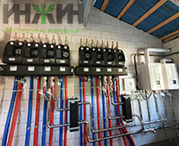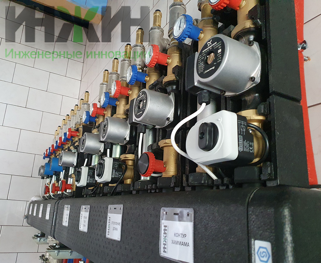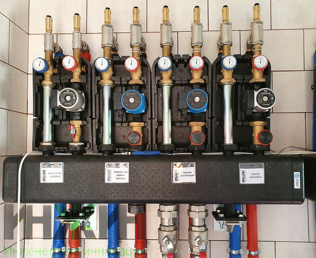 - Установка двух распределительных коллекторов STOUT с 8-ю насосными группами для контуров теплоснабжения: отопления дома, теплого пола дома, отопления бани с бассейном, теплообменника бассейна, теплоснабжения вентиляции бассейна, теплого пола бани, теплоснабжения хаммама и бойлера ГВС. Выполнено подключение насосных групп к существующим магистралям;
