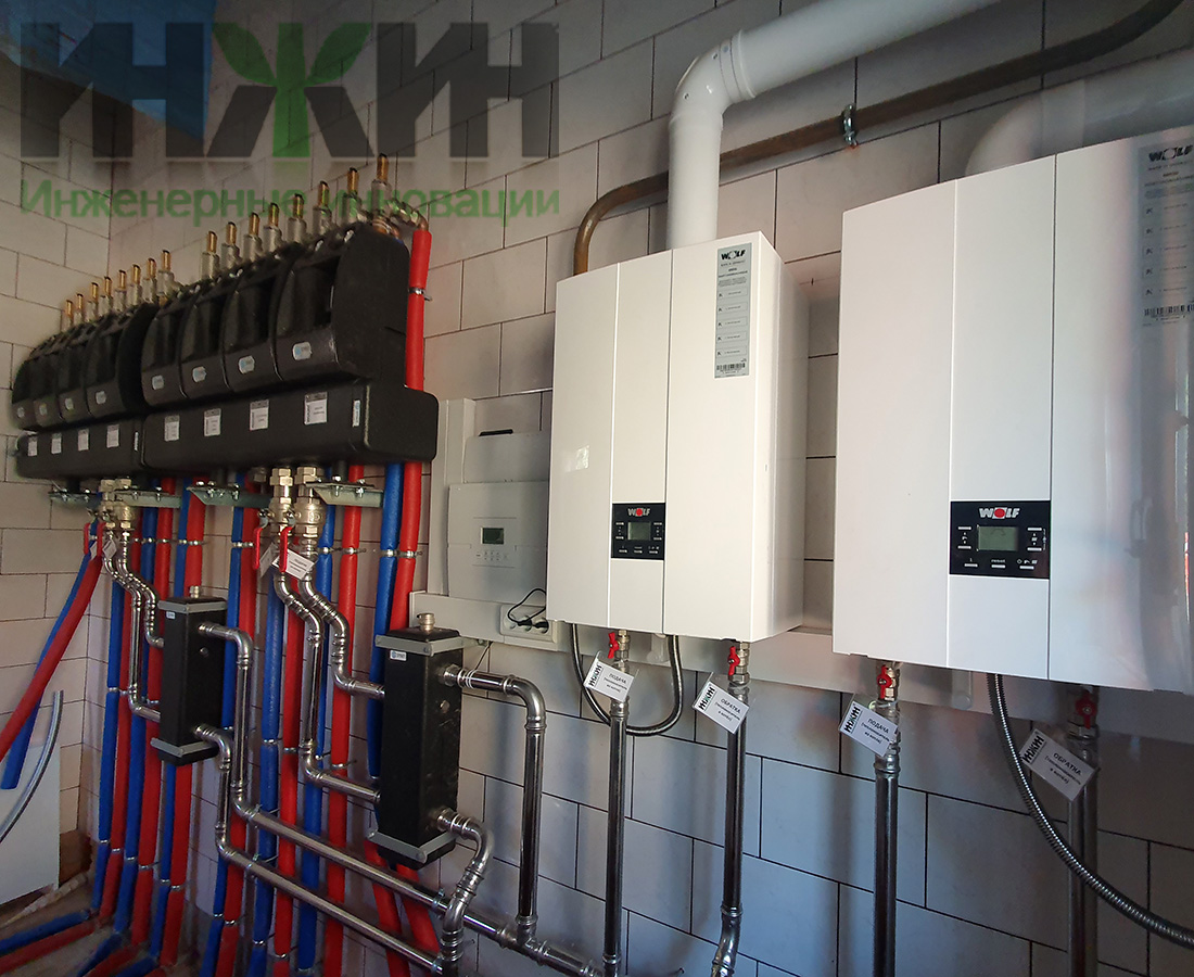 - Монтаж двух настенных газовых конденсационных котлов Wolf (поставка Заказчика), мощностью 35 кВт каждый с установкой коаксиальных дымоходов "через стену";