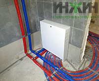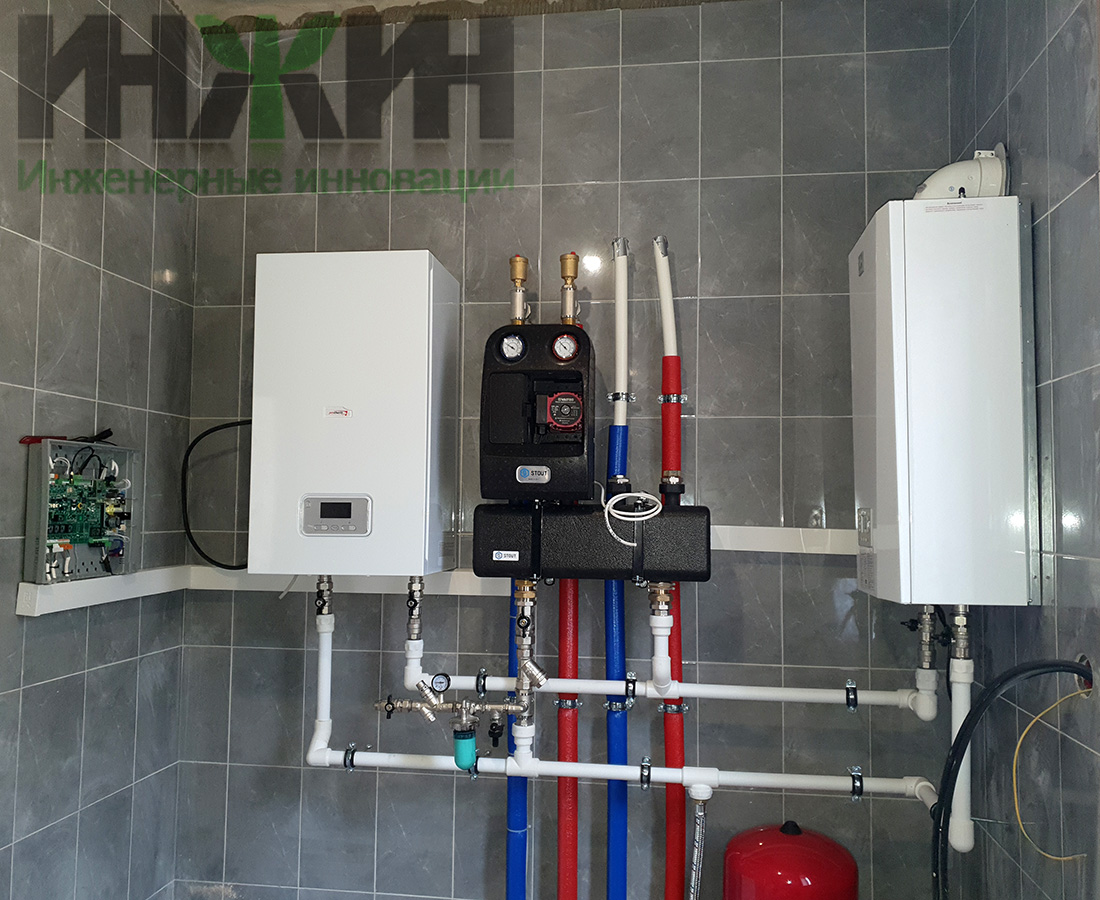 - Монтаж распределительного коллектора STOUT с насосно-смесительными группам и встроенной гидравлической стрелкой;