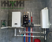- Установка двух теплогенераторов - основного, настенного газового котла Лемакс Prime-V24 HO, мощностью 24 кВт (с закрытой камерой сгорания) и резервного - электрического котла Protherm Скат, мощностью 12 кВт;