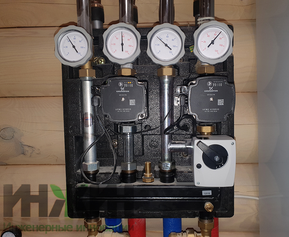 - Монтаж распределительного коллектора Meibes с насосно-смесительными группам и встроенной гидравлической стрелкой;