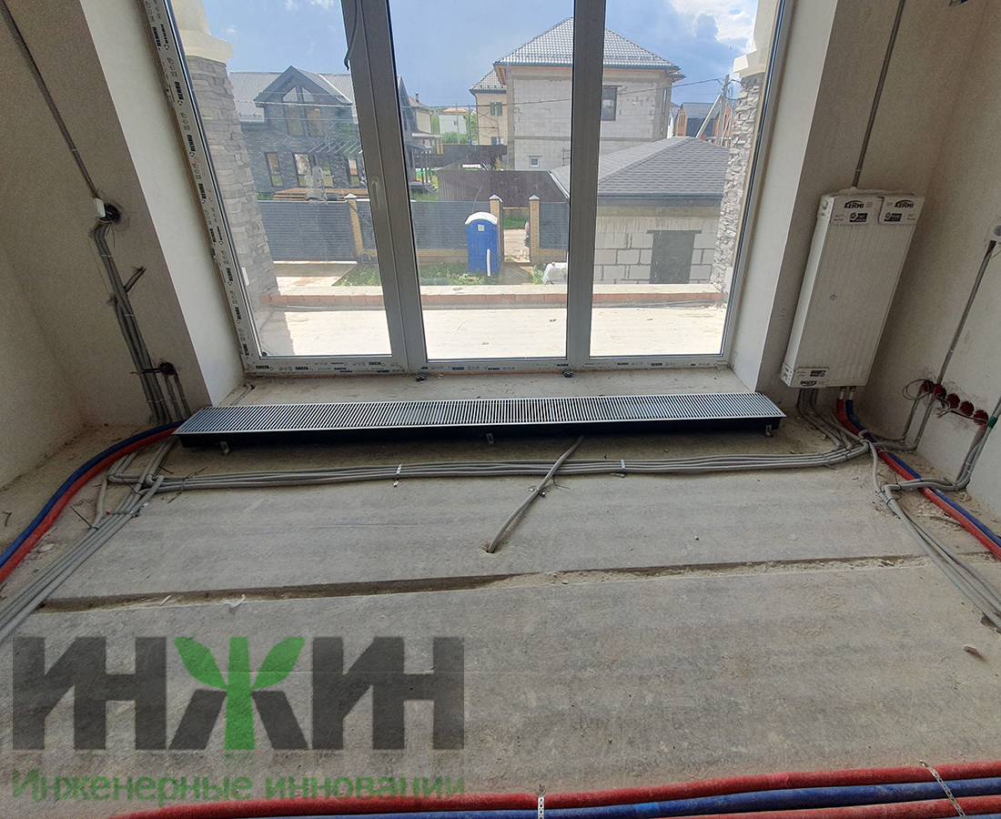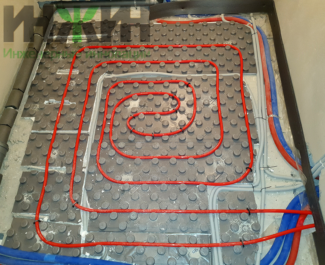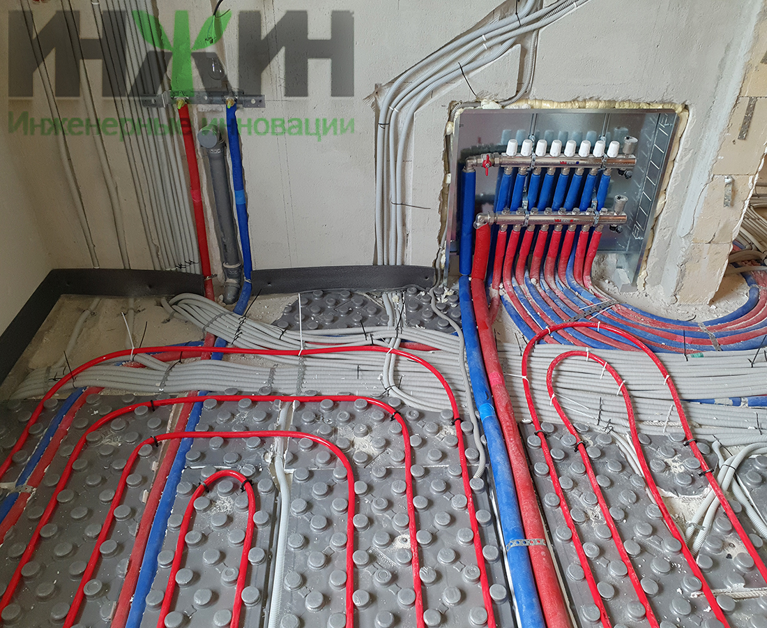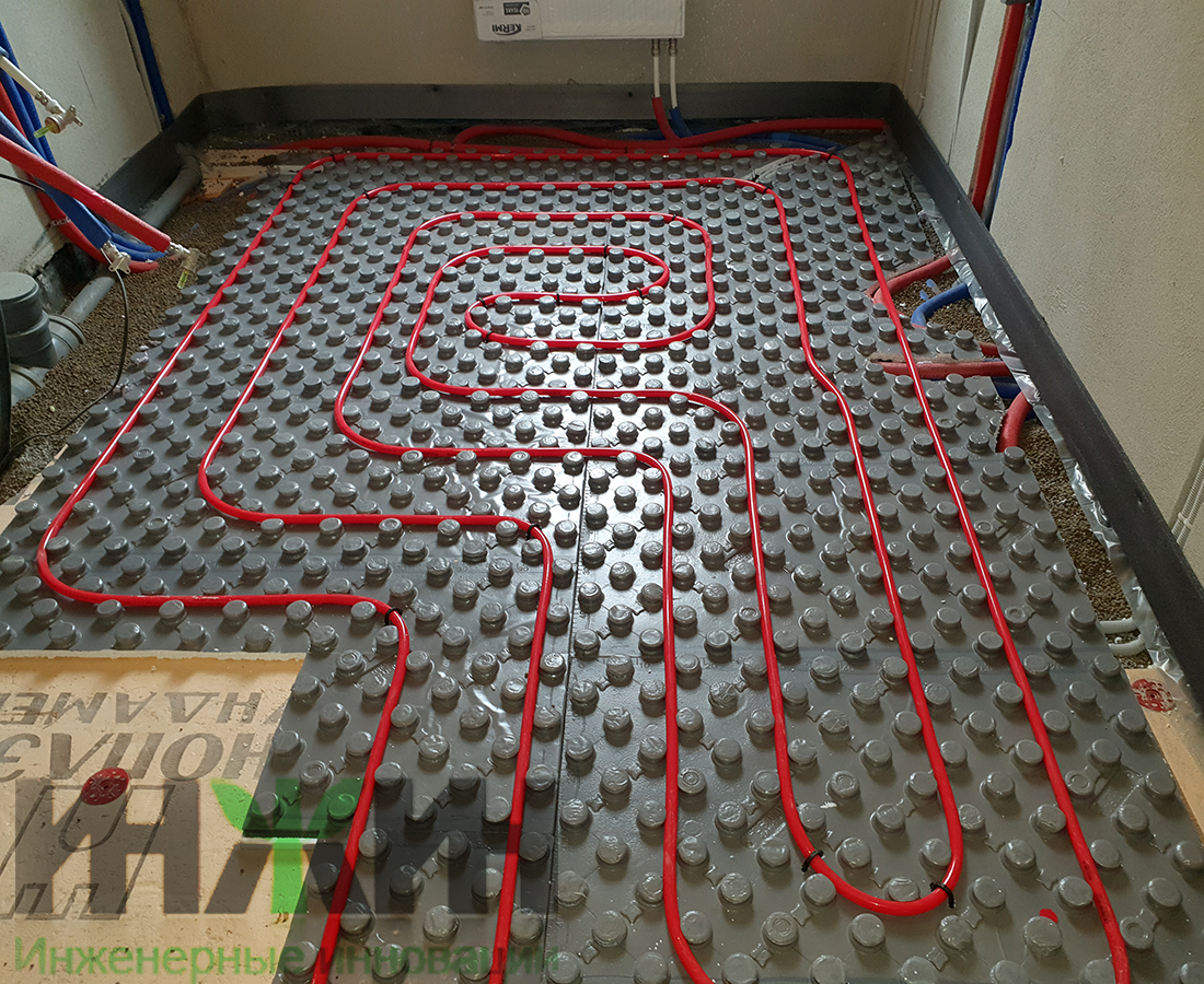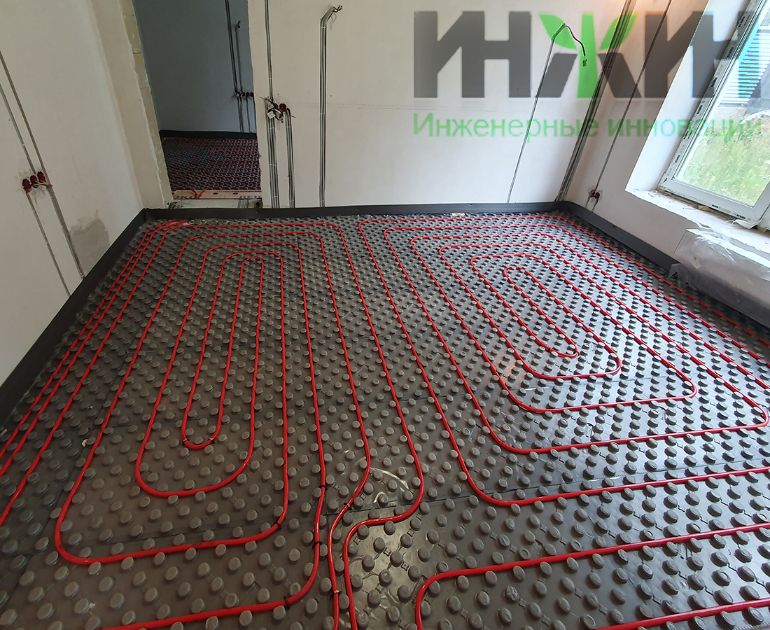 - Монтаж водяного теплого пола выполнен на матах с бобышками и пленкой Формат на площади 104 м.кв.;