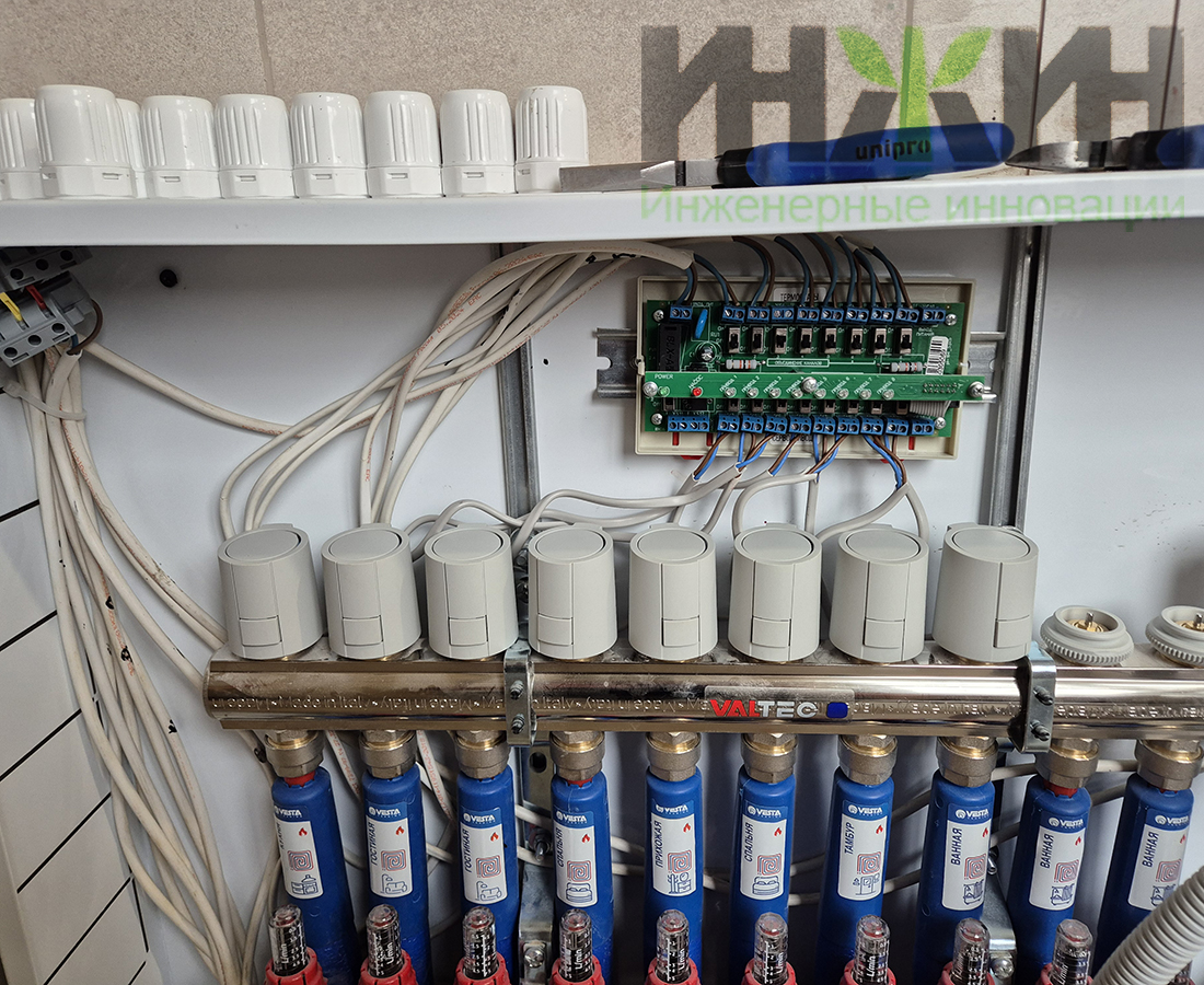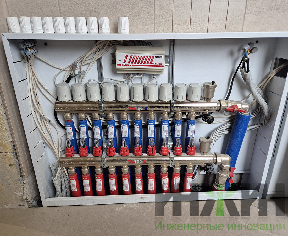 - Установлены распределительный коллектор с расходомерами Valtec на 10 отводов;