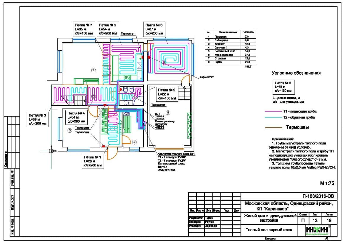 o Водяной теплый пол в доме предусмотрен на площади 87 м.кв., 10 петель;