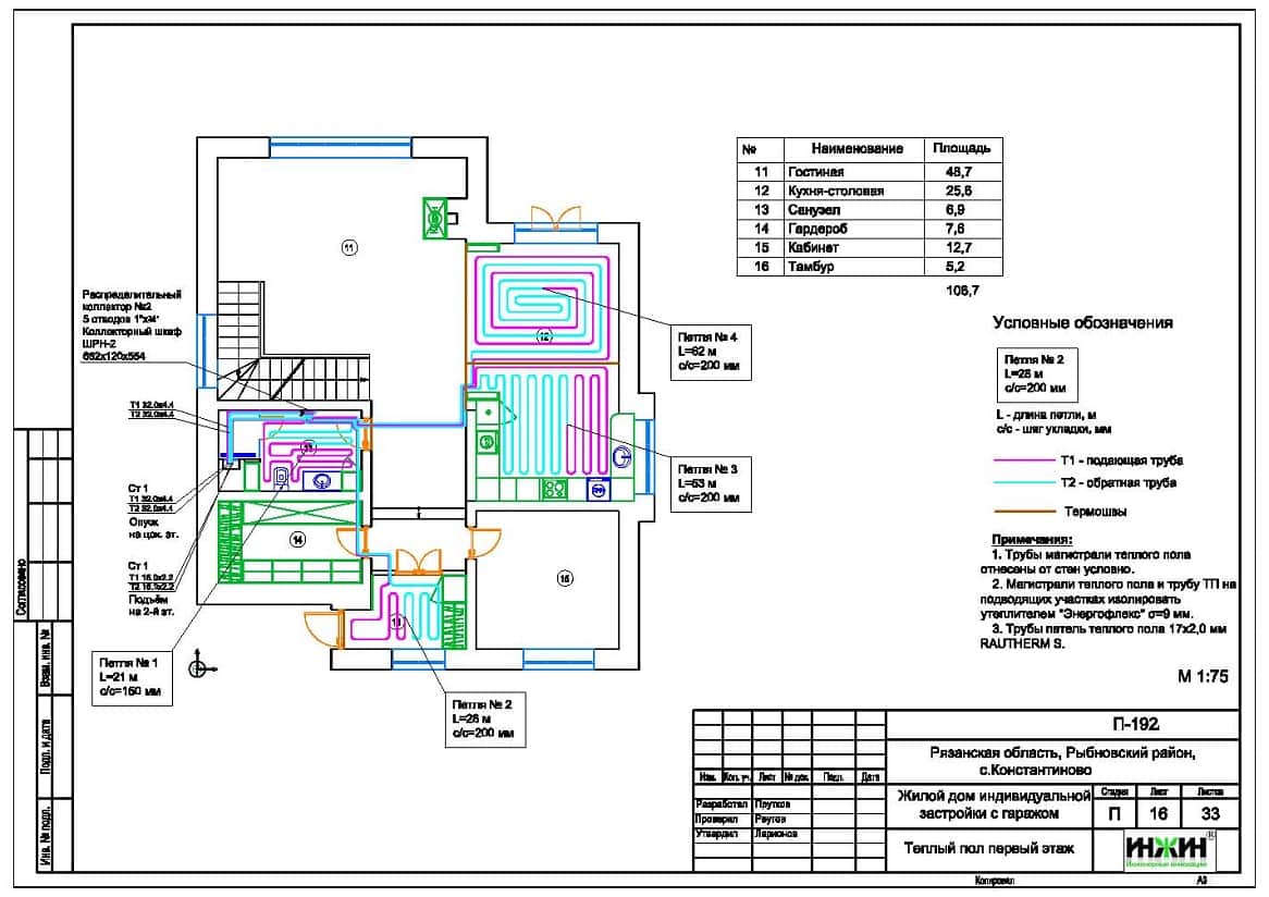 o Водяной теплый пол в доме предусмотрен на площади 85 м.кв., 7 петель, в гараже – на площади 25 м.кв., 2 петли;