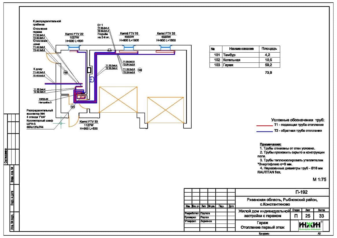 o Выполнен теплотехнический расчет отопления гаража, с учетом теплопотерь через ограждающие конструкции, теплоотдачи отопительных приборов, теплого пола и оборудования в котельной;