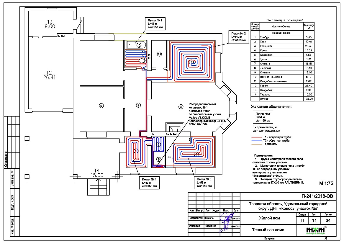 o Водяной теплый пол в доме предусмотрен на площади 34 м.кв., 4 петли;