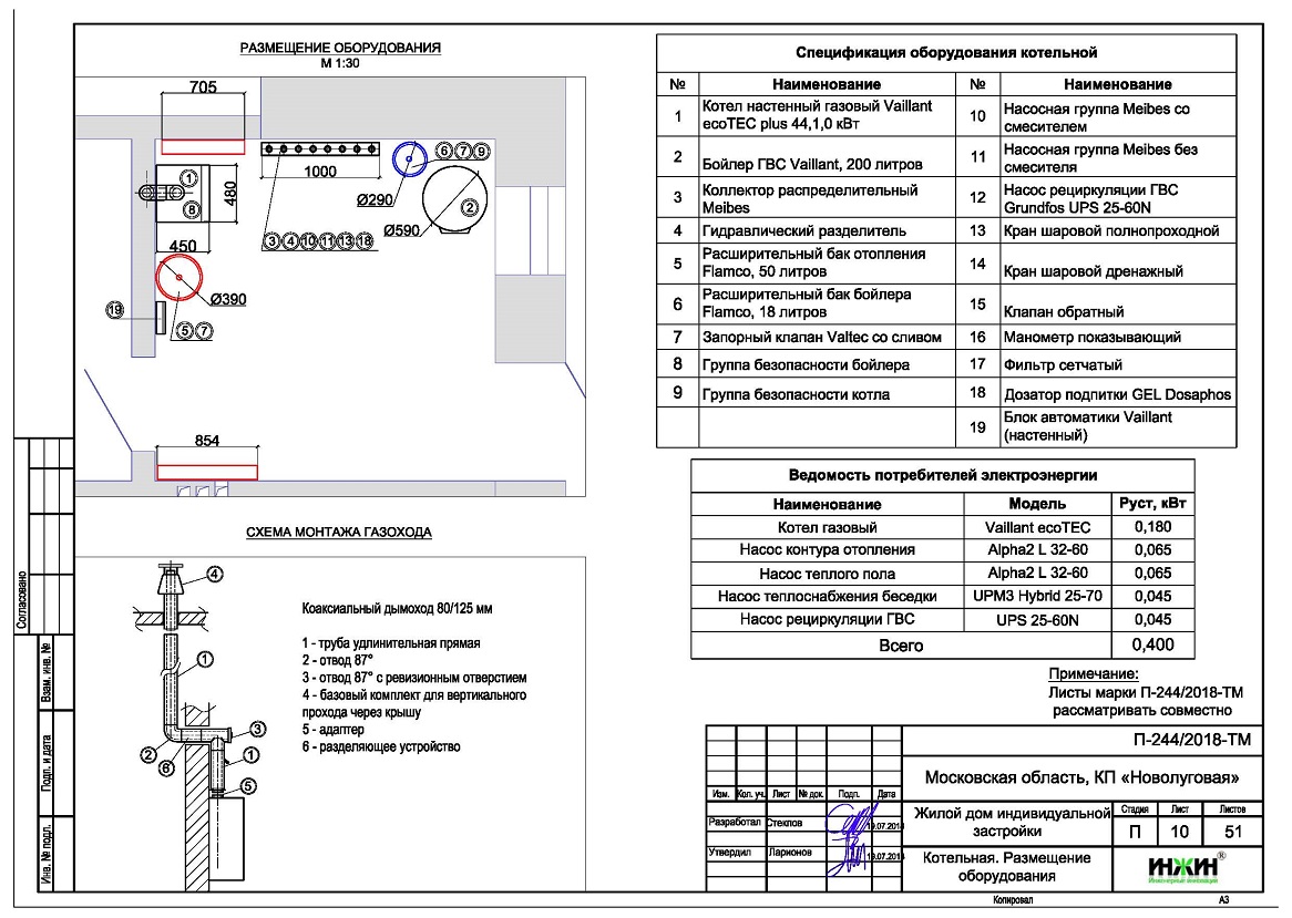 Состав проекта котельной отопления, водоснабжения и канализации дома в КП «Новолуговая»: