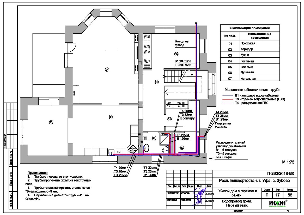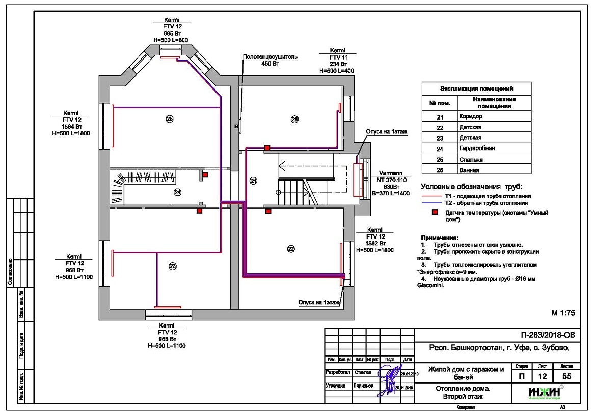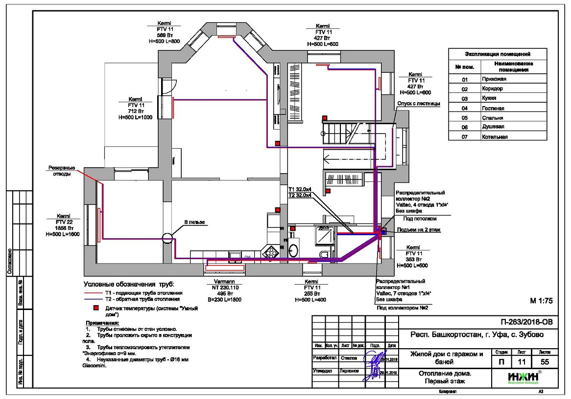 Объем проекта отопления, канализации и водоснабжения дома в Уфе: 55 листов.