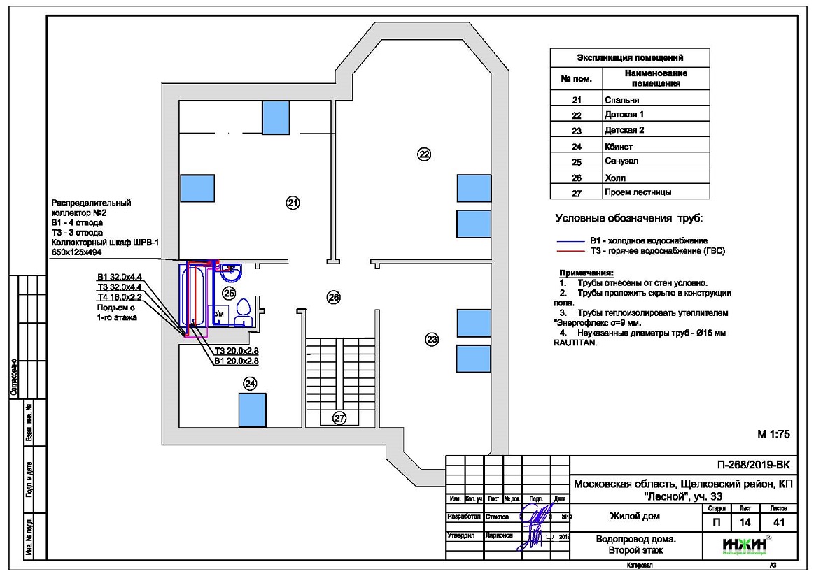 o Схема внутреннего водоснабжения дома – коллекторно-лучевая с рециркуляцией горячей воды через водяные полотенцесушители, выполнен расчет 18-ти точек водоснабжения и полотенцесушителей;
