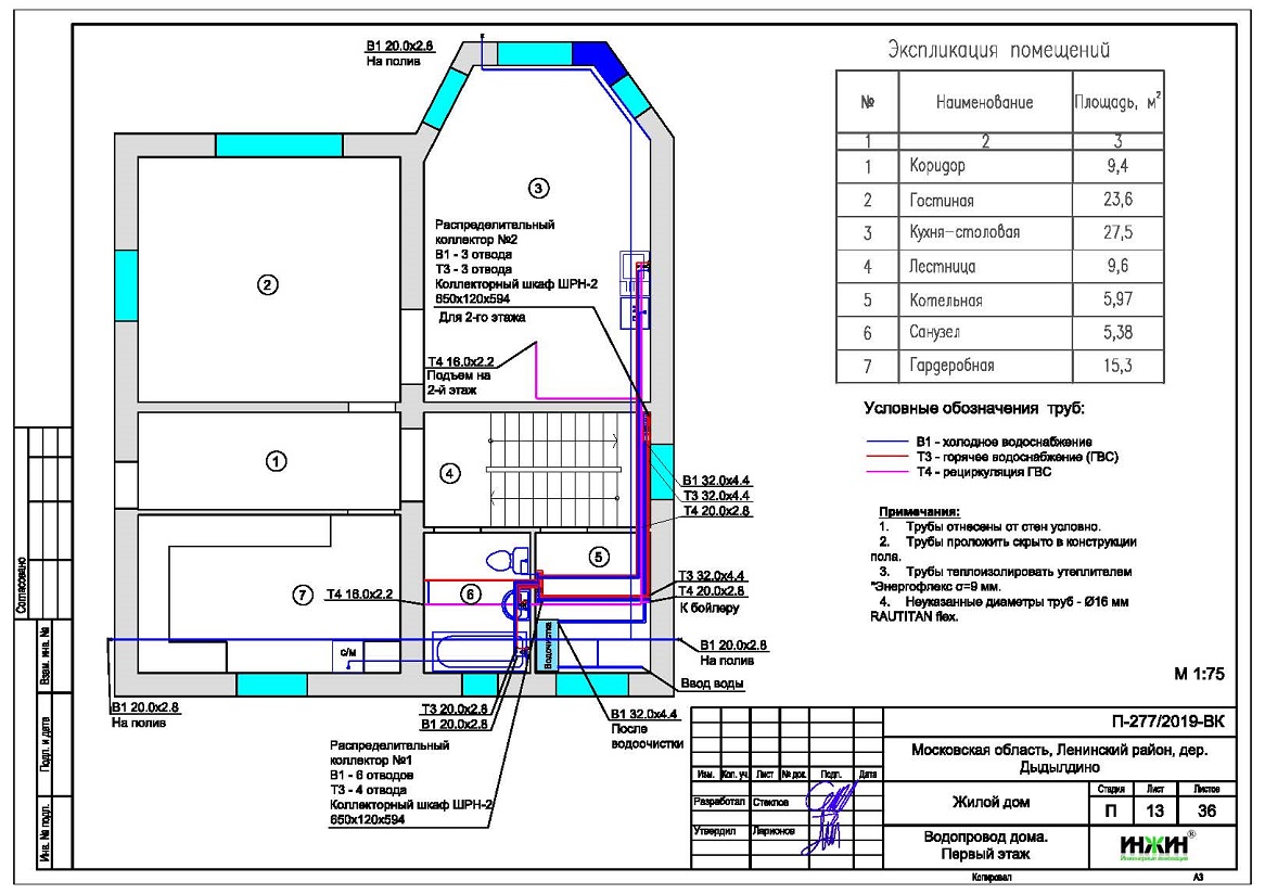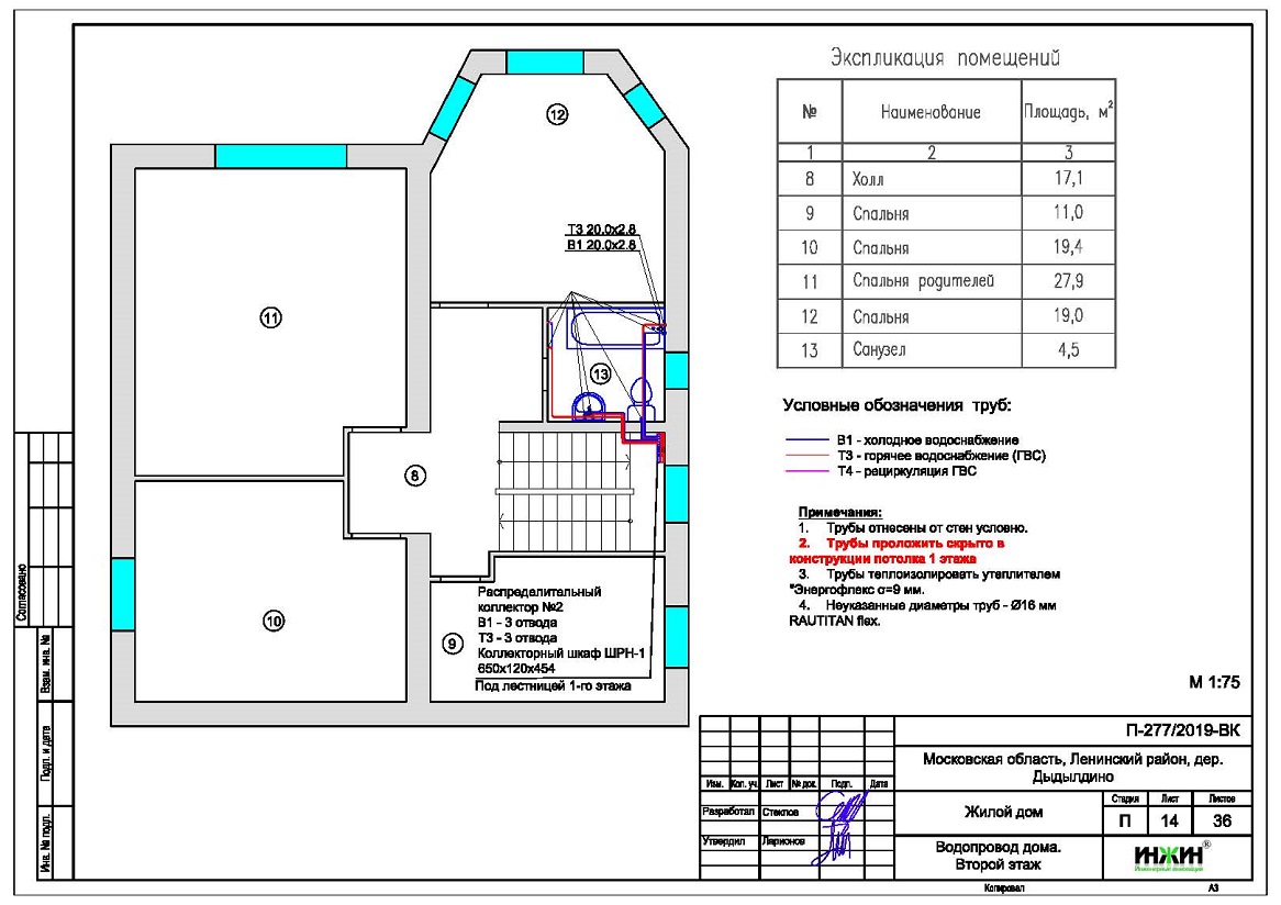 o Схема внутреннего водоснабжения дома – коллекторно-лучевая, с рециркуляцией горячей воды через водяные полотенцесушители, выполнен расчет 19-ти точек водоснабжения и полотенцесушителей;