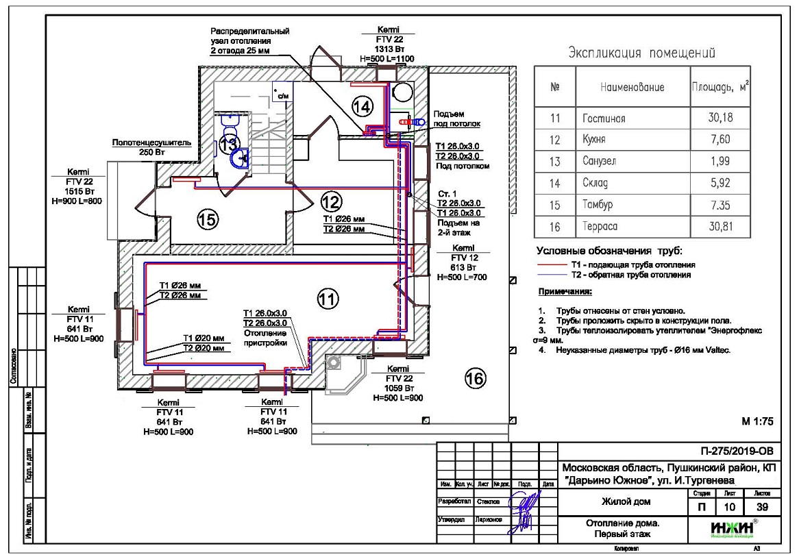 Объем проекта отопления, канализации и водоснабжения кирпичного дома: 39 листов.
