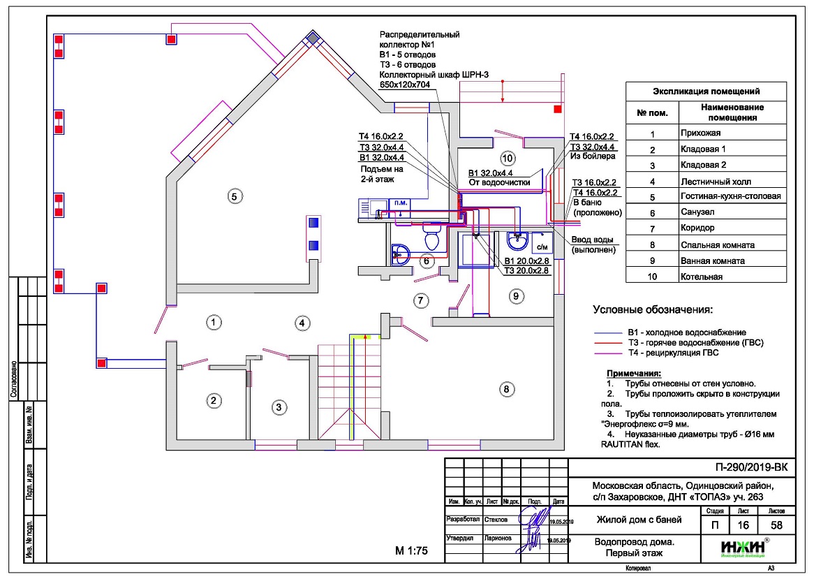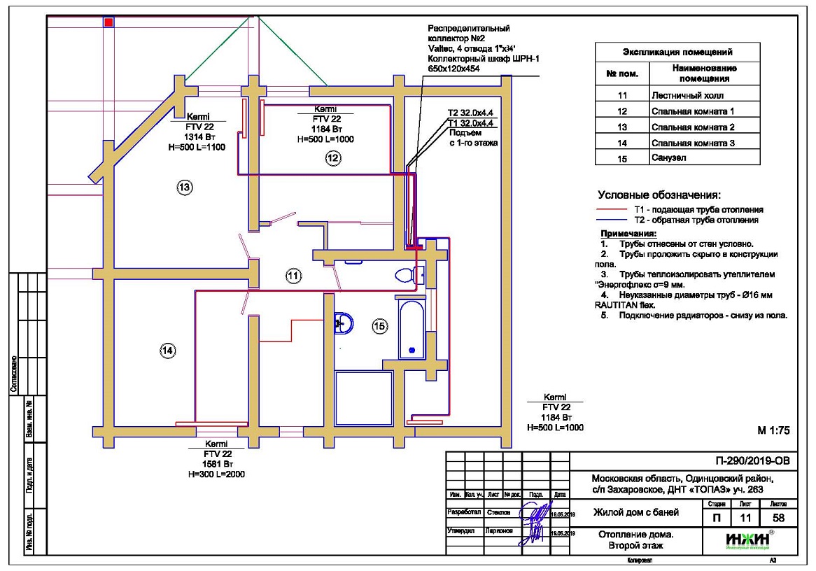 Объем проекта отопления, канализации и водоснабжения дома с баней: 58 листов.