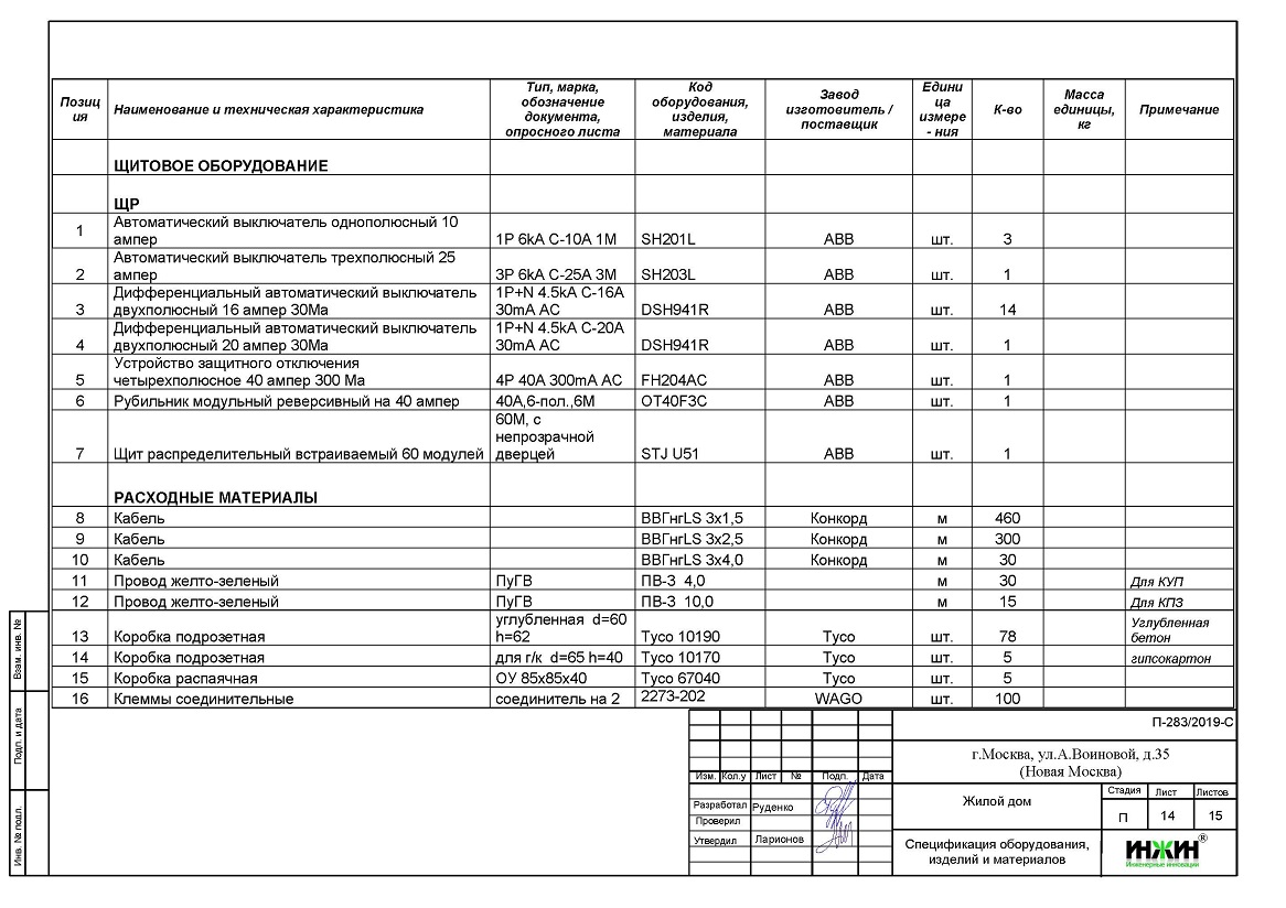 5. Спецификация материалов и оборудования по электрике и электропроводке дома в КП "Сатинские Пруды".