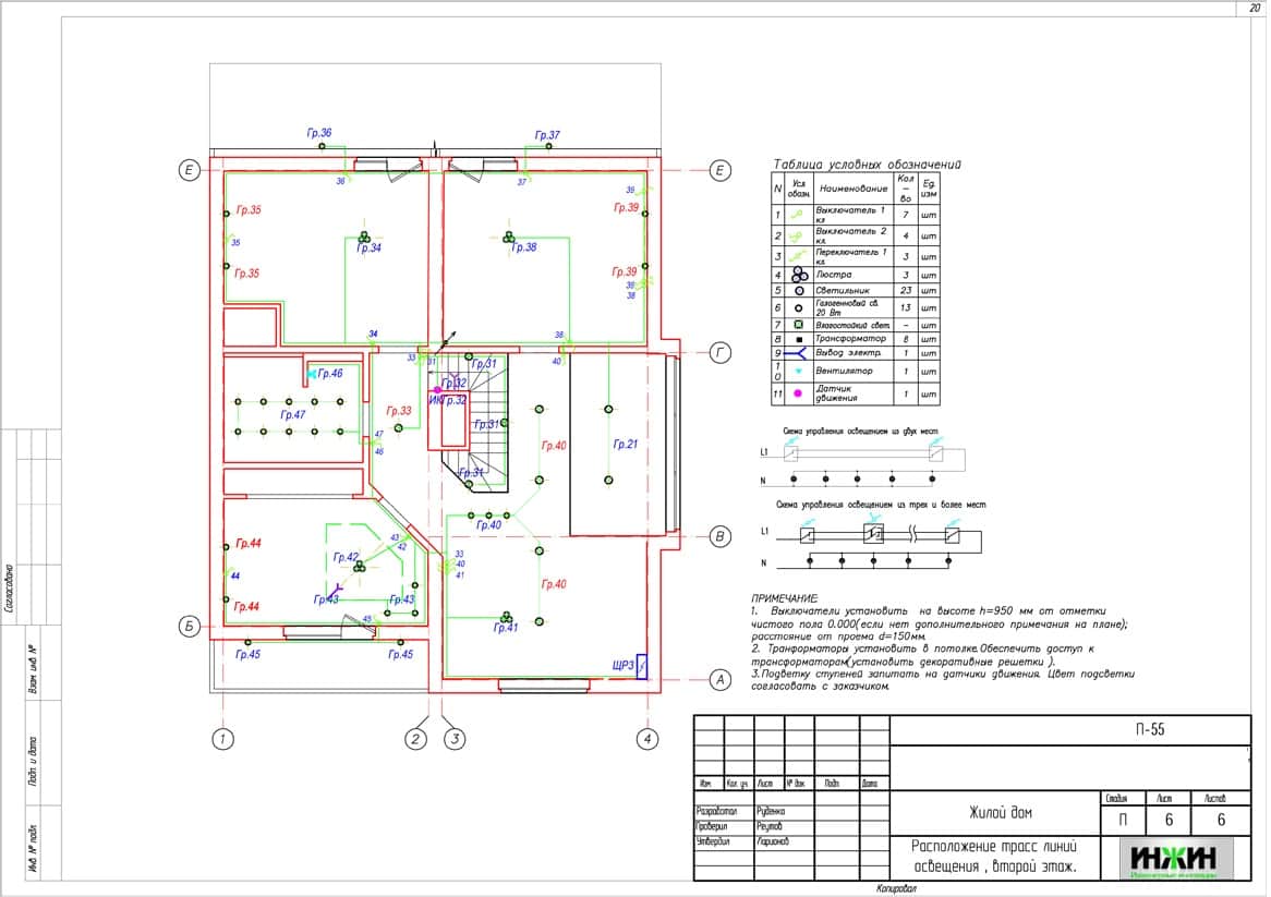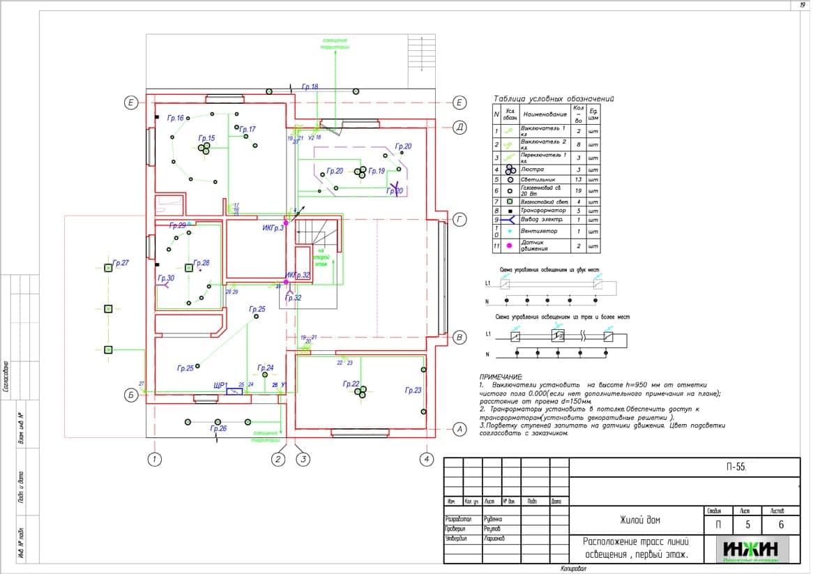 Поэтажные планы групповых осветительных сетей.