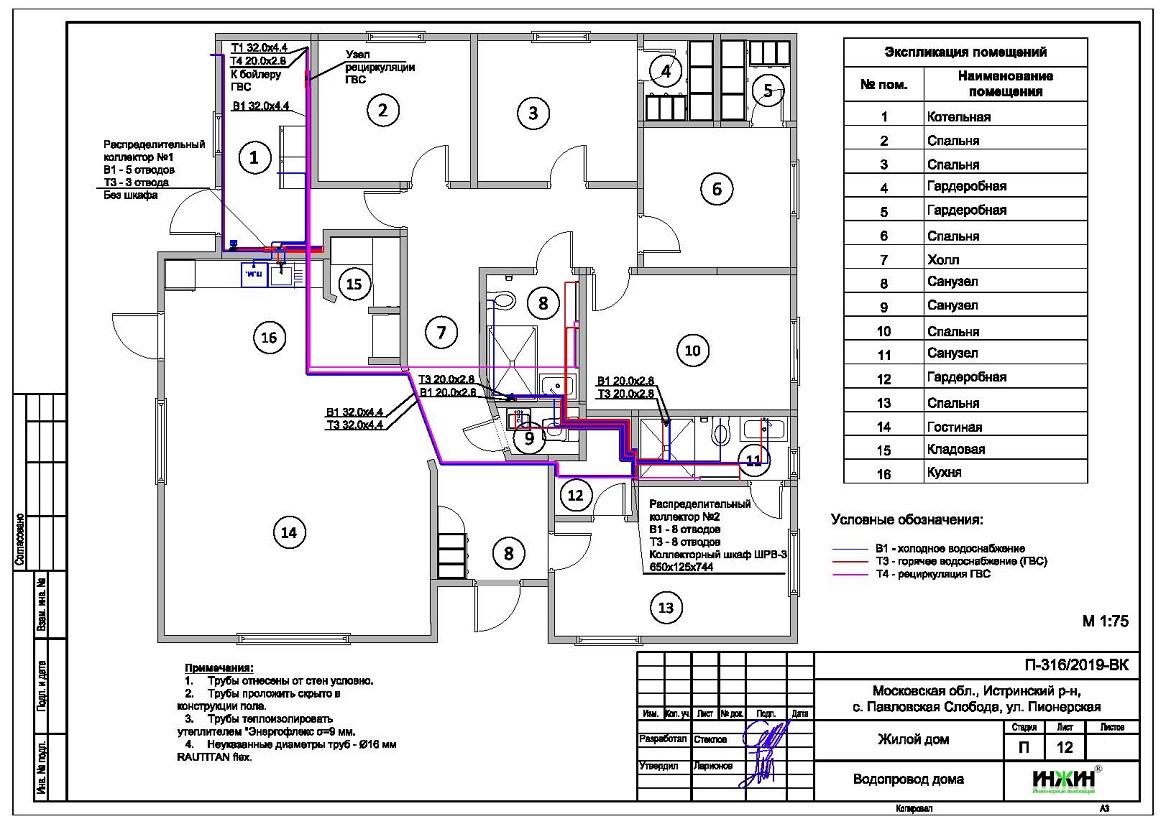 o Схема внутреннего водоснабжения дома – коллекторно-лучевая с рециркуляцией горячей воды через водяные полотенцесушители, выполнен расчет 27-и точек водоснабжения и полотенцесушителей;