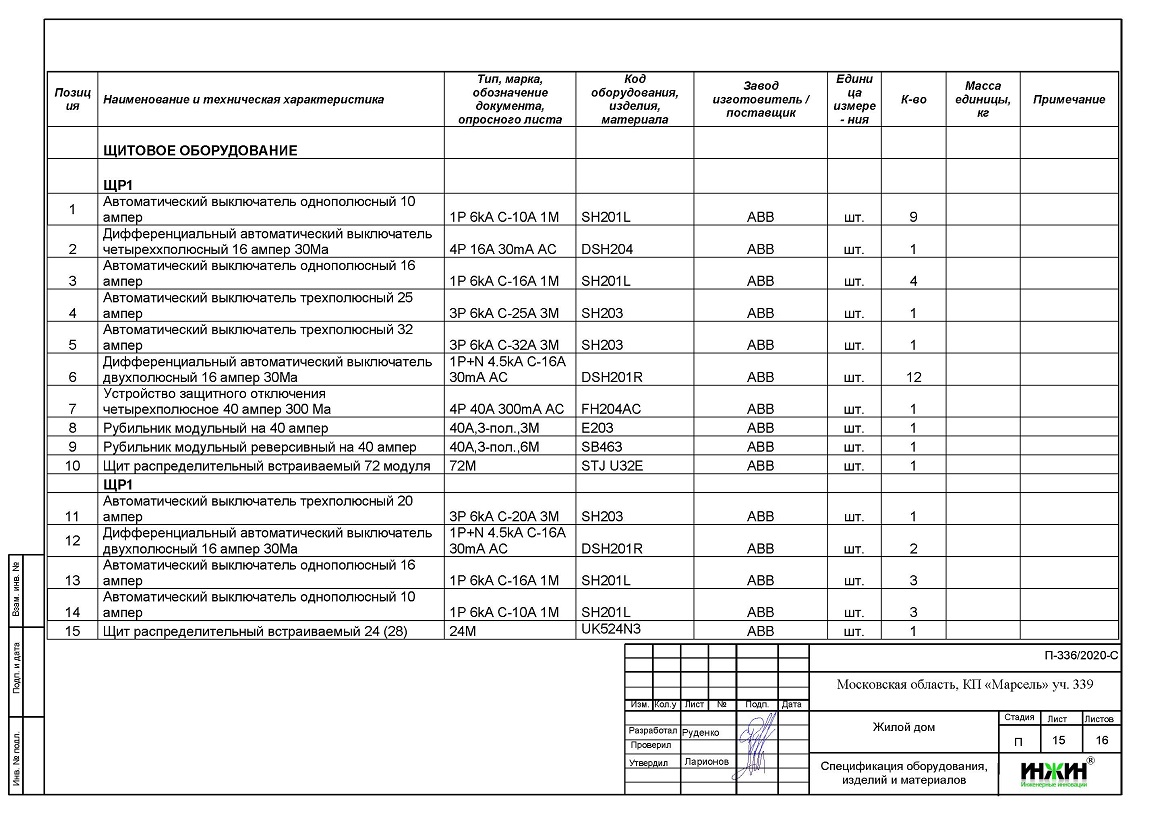 5. Спецификация материалов и оборудования по электрике и электропроводке дома в КП "Марсель".