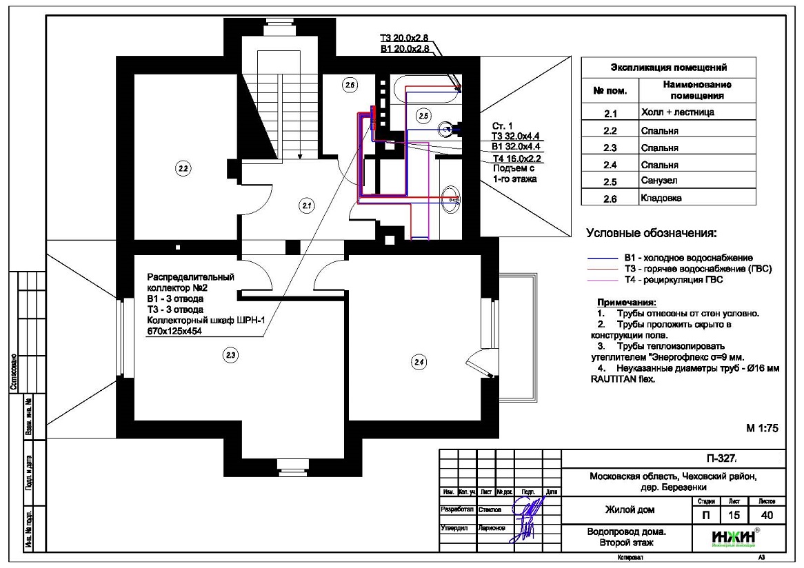 o Схема внутреннего водоснабжения дома – коллекторно-лучевая с рециркуляцией горячей воды через водяные полотенцесушители, выполнен расчет 18-и точек водоснабжения и полотенцесушителей;