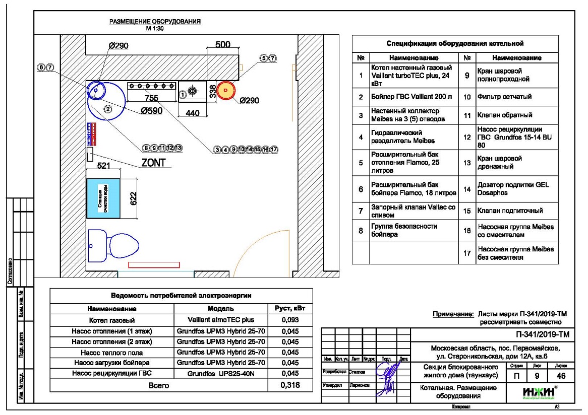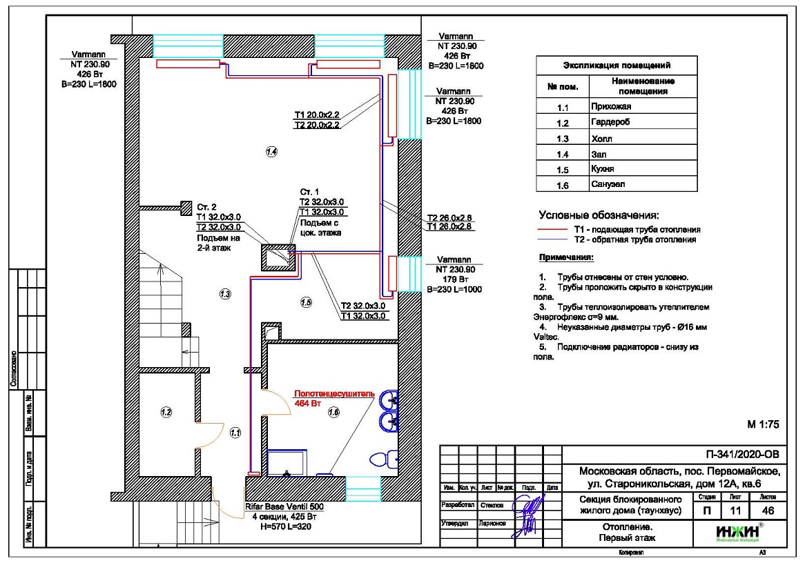 Объем проекта отопления, канализации и водоснабжения таунхауса: 46 листов.