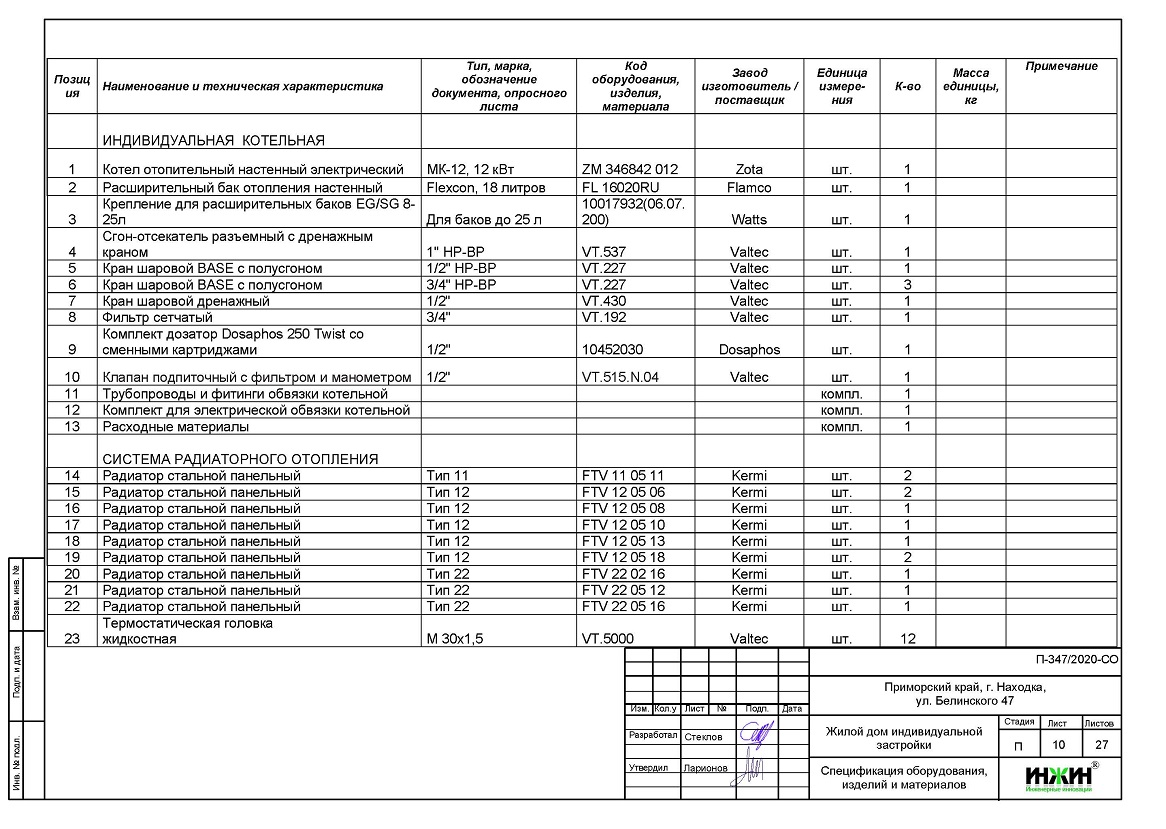6. Спецификация материалов и оборудования по котельной и отоплению дома в г. Находка.