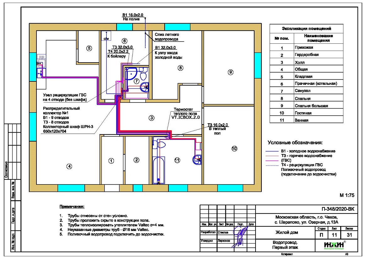 o Схема внутреннего водоснабжения дома – коллекторно-лучевая с рециркуляцией горячей воды через водяные полотенцесушители, выполнен расчет 19-и точки водоснабжения и полотенцесушителей;