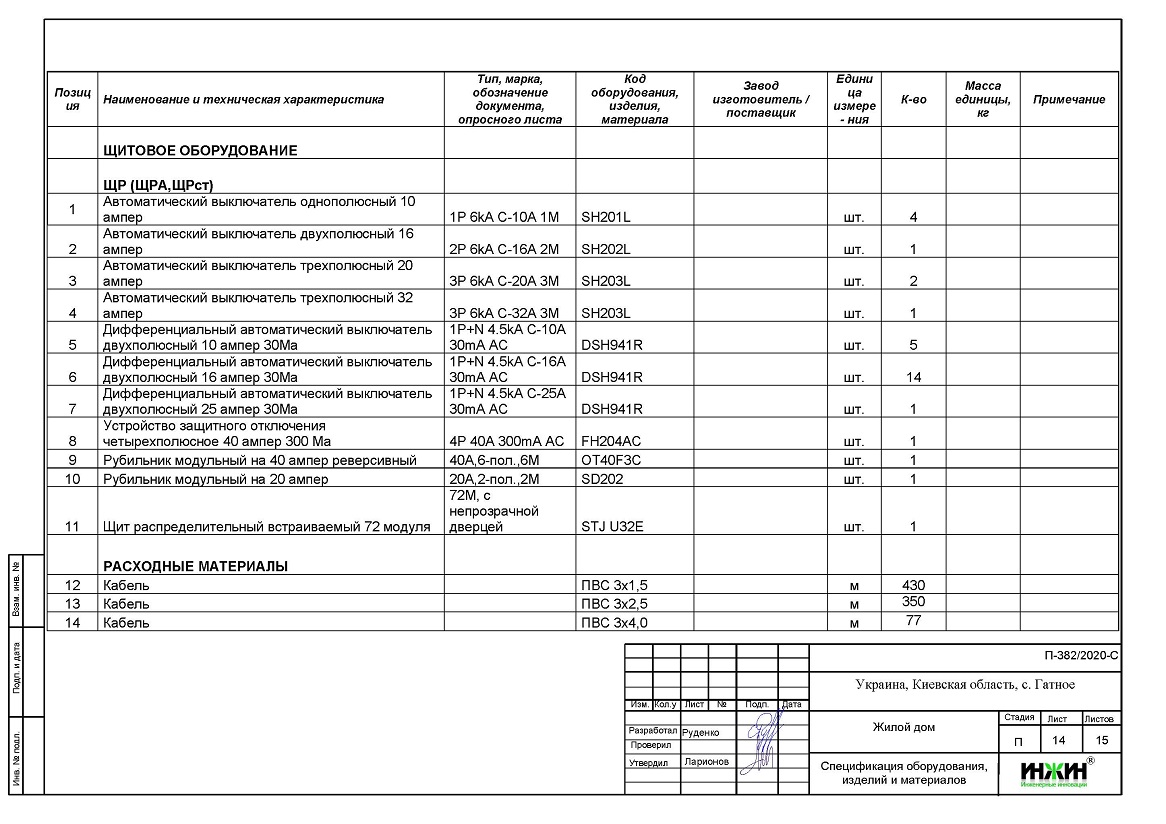 5. Спецификация материалов и оборудования по электрике и электропроводке дома в с. Гатное Киевской области.