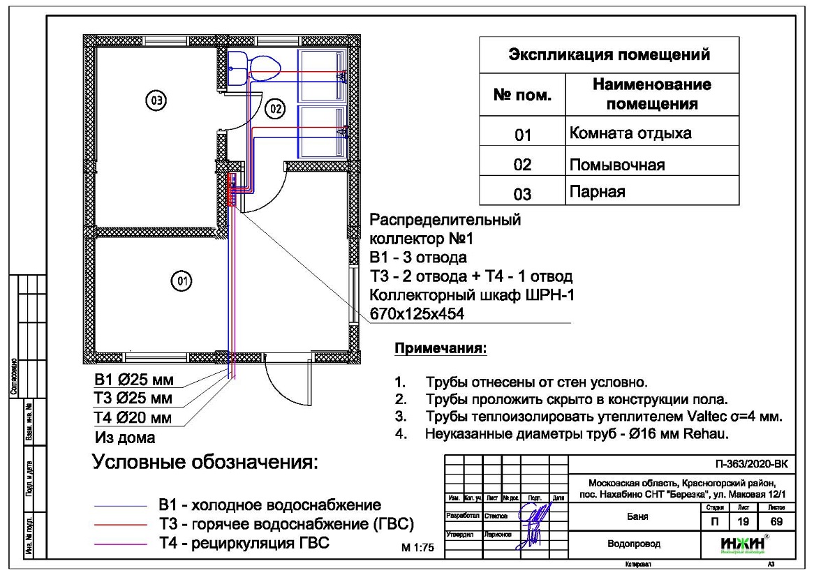 o Схема внутреннего водопровода всех строений – коллекторная, с рециркуляцией горячей воды через коллекторы и полотенцесушители;