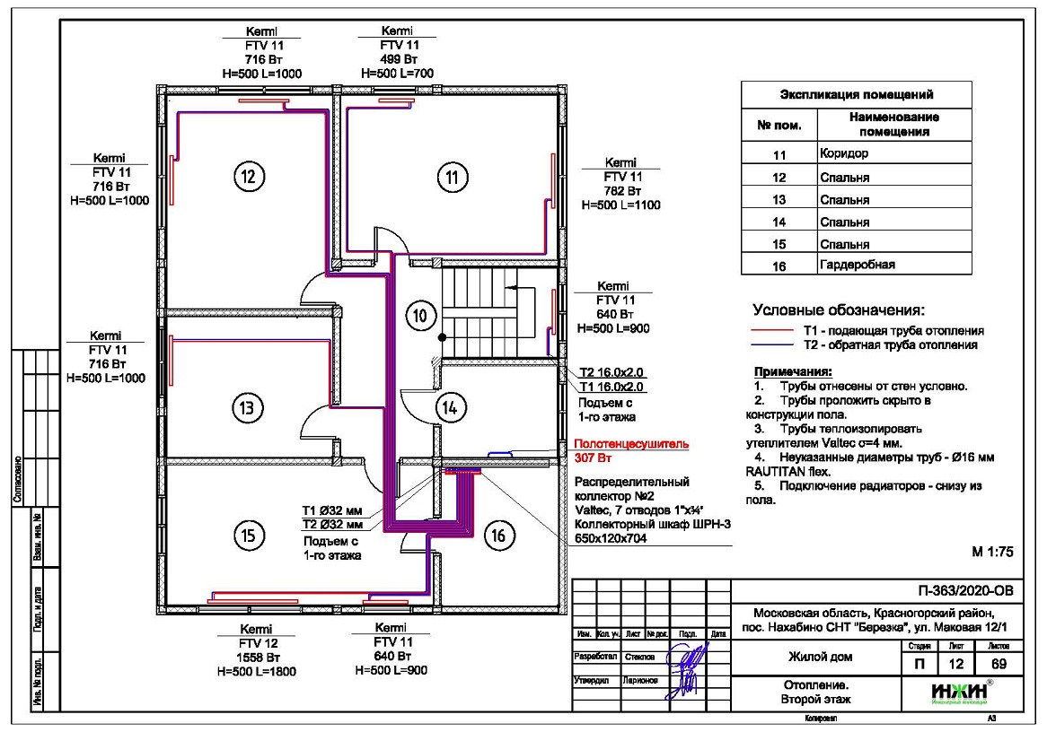 o Схема радиаторного отопления всех трех строений двухтрубная, коллекторно-лучевая, с принудительной циркуляцией теплоносителя и температурным графиком 80/60°С;