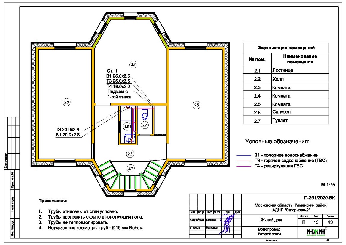 o Схема внутреннего водоснабжения дома – тройниковая с рециркуляцией горячей воды через водяные полотенцесушители, выполнен расчет 18-ти точек водоснабжения и полотенцесушителей;
