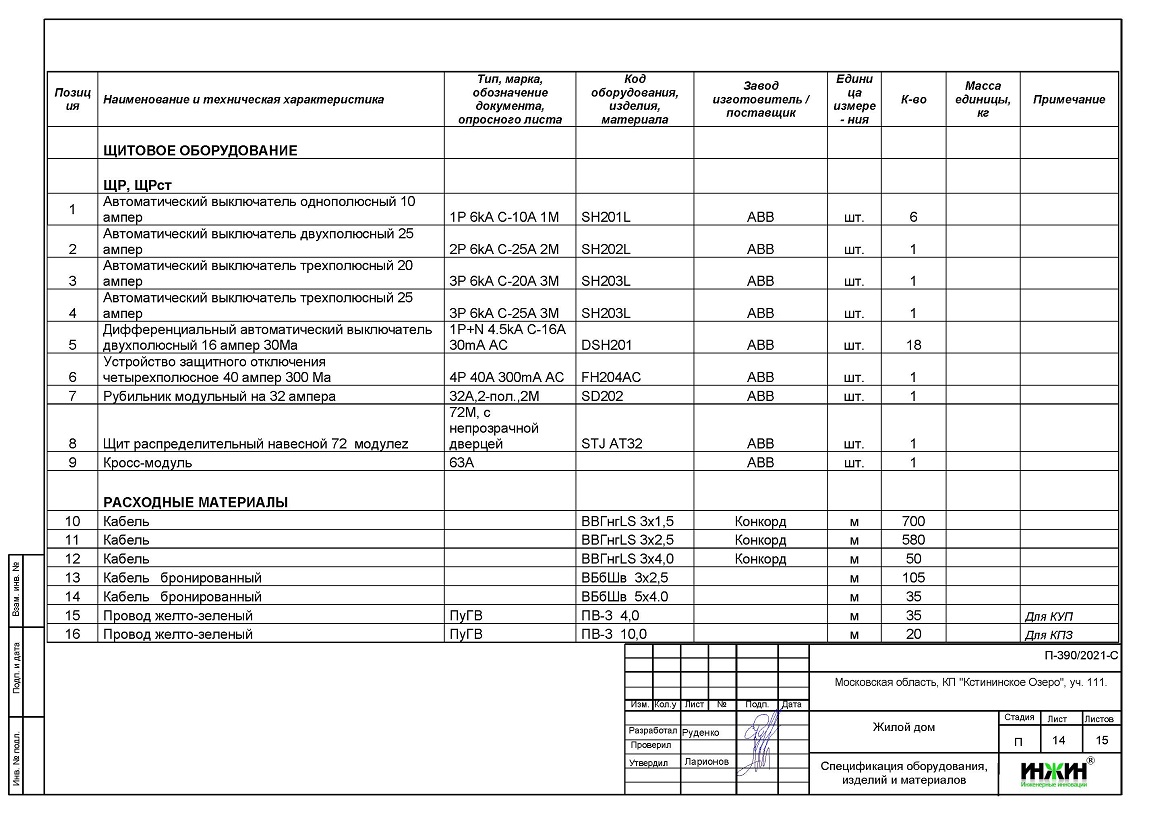 5. Спецификация материалов и оборудования по электрике и электропроводке дома в КП "Кстининское Озеро".