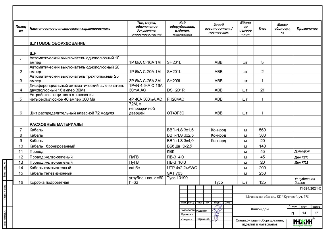 5. Спецификация материалов и оборудования по электрике и электропроводке дома в КП "Кратово".