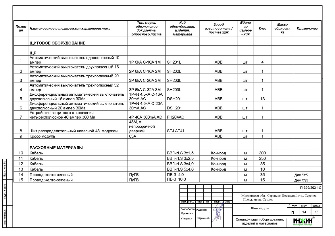5. Спецификация материалов и оборудования по электрике и электропроводке дома в мкр Семхоз (Сергиев Посад).