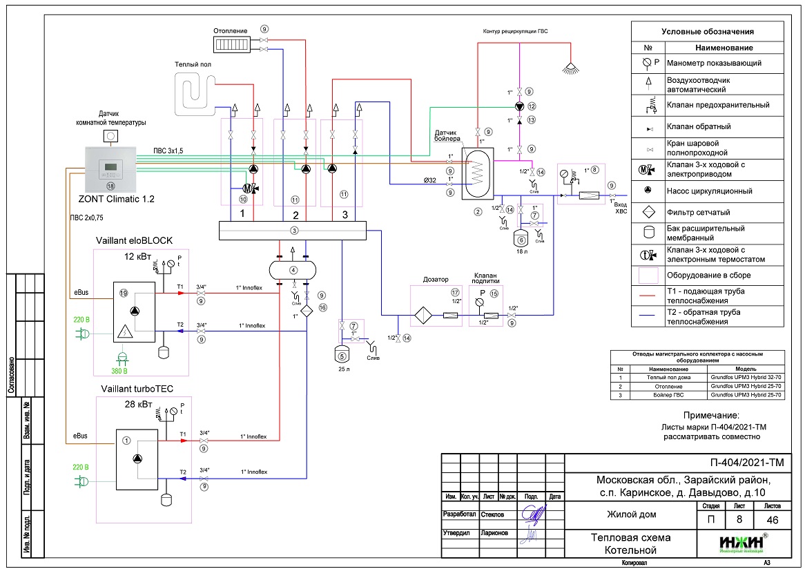 o Контуры теплоснабжения котельной – радиаторное отопление дома, теплый пол и горячее водоснабжение, для которого предусмотрен накопительный бойлер Vaillant uniSTOR, объемом 200 литров (подключение к коллектору);