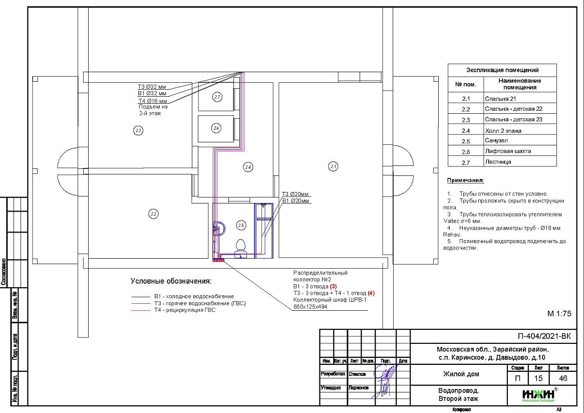 o Схема внутреннего водоснабжения дома – коллекторно-лучевая с рециркуляцией горячей воды через водяные полотенцесушители, выполнен расчет 20-ти точек водоснабжения и полотенцесушителей;