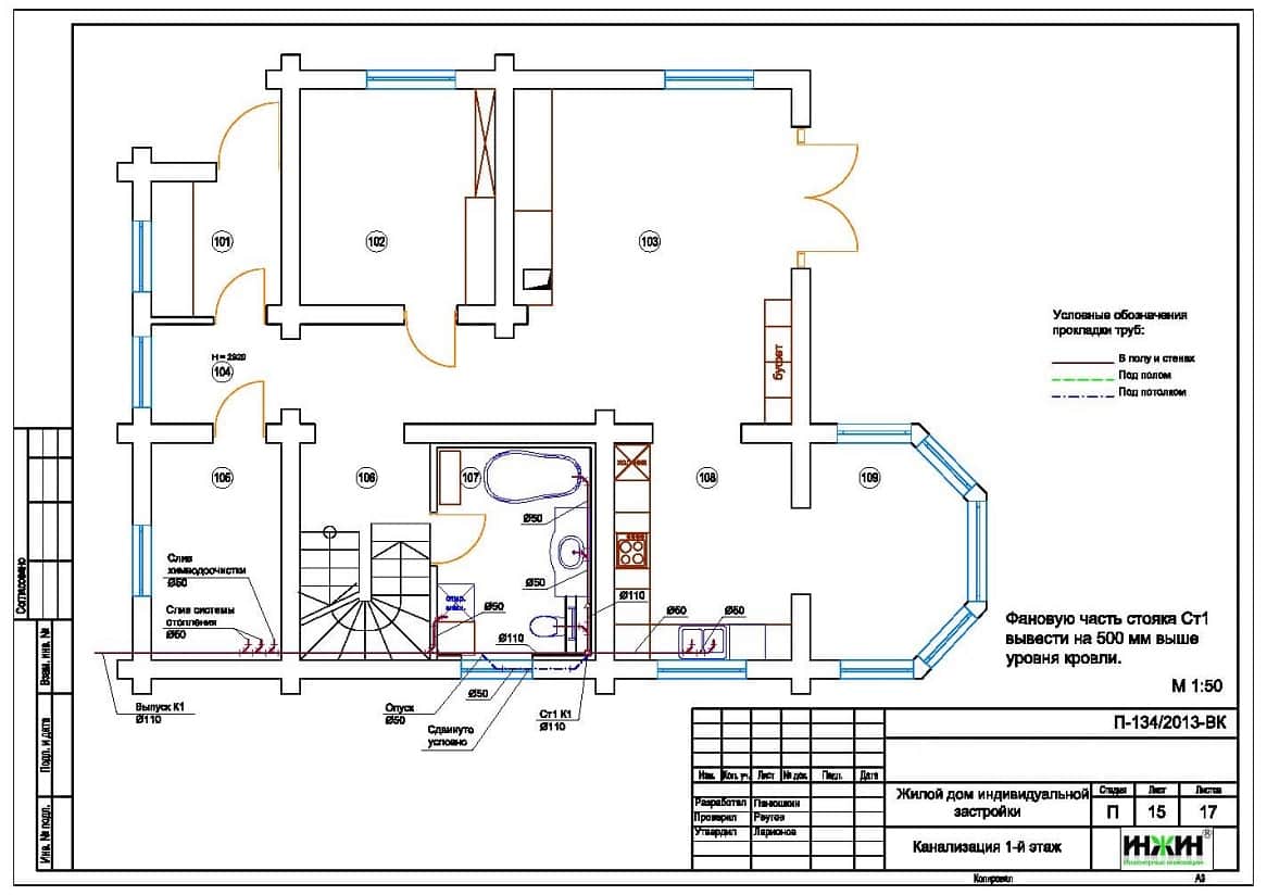 6. Комплект чертежей внутреннего водопровода и канализации деревянного дома.