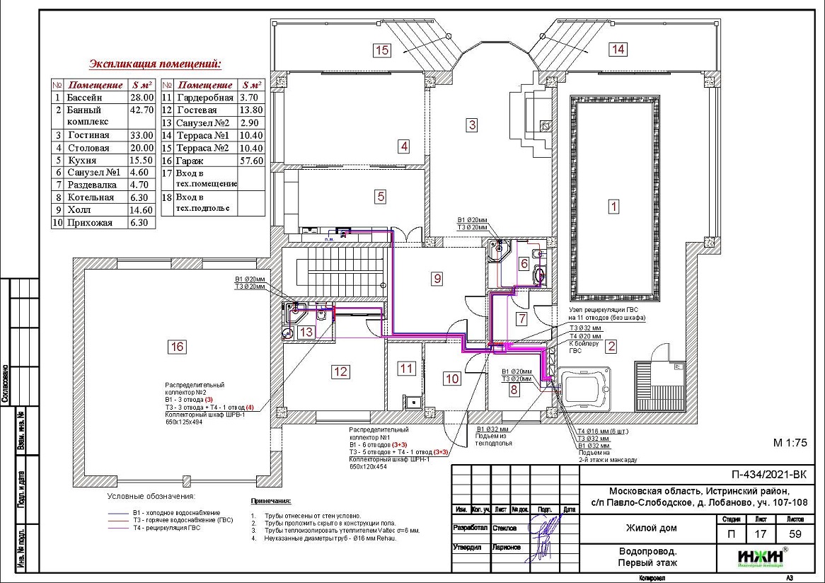 o Схема внутреннего водоснабжения дома – коллекторно-лучевая с рециркуляцией горячей воды через водяные полотенцесушители, выполнен расчет 38-и точек водоснабжения и полотенцесушителей;