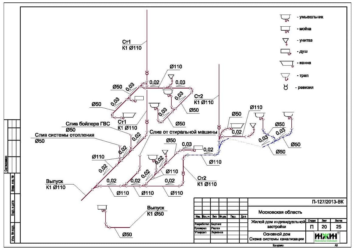 Комплект чертежей внутреннего водопровода и канализации основного и гостевого домов.