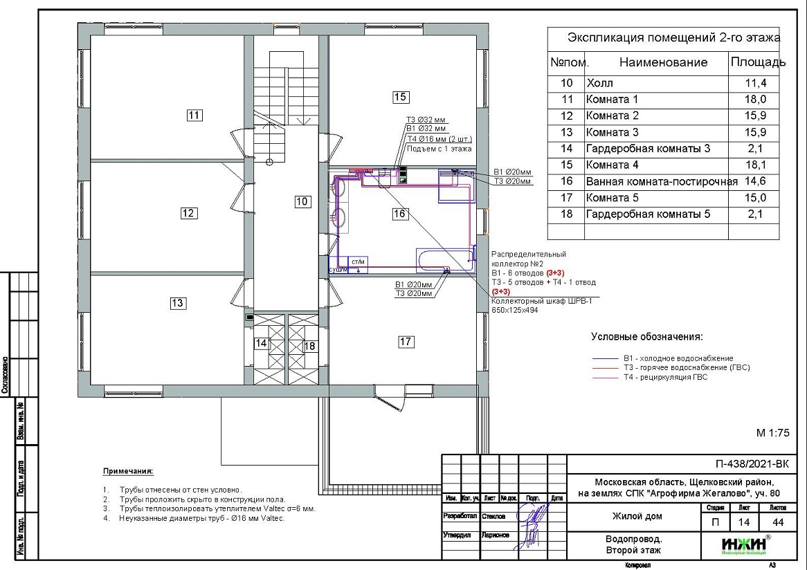 o Схема внутреннего водоснабжения дома – коллекторно-лучевая с рециркуляцией горячей воды через водяные полотенцесушители, выполнен расчет 25-ти точек водоснабжения и полотенцесушителей;