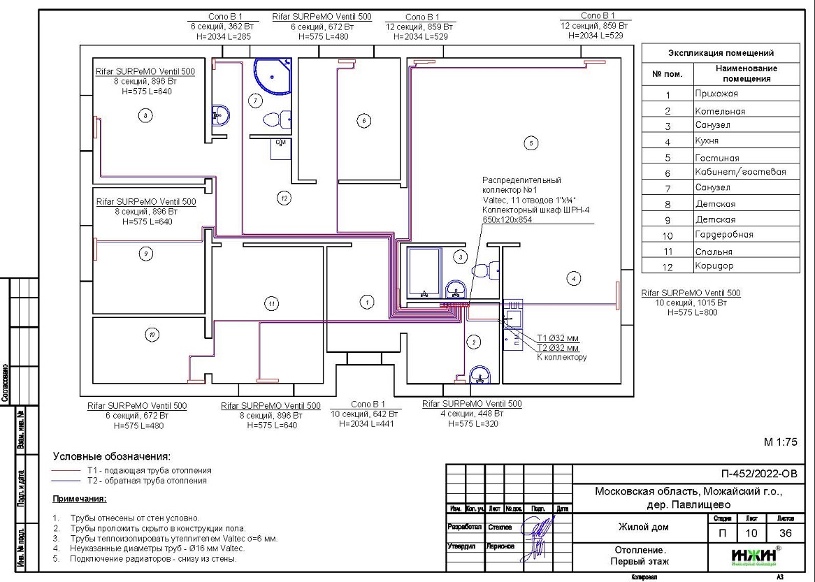 Объем проекта отопления, канализации и водоснабжения дома в дер. Павлищево: 36 листов.