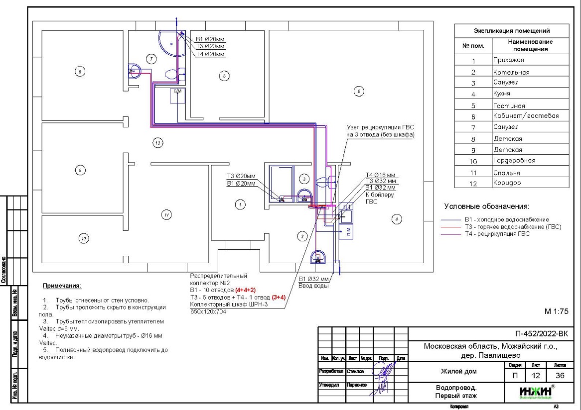 o Схема внутреннего водоснабжения дома – коллекторно-лучевая с рециркуляцией горячей воды через водяные полотенцесушители, выполнен расчет 16-ти точек водоснабжения;