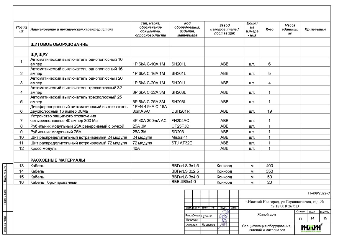 5. Спецификация материалов и оборудования по электрике и электропроводке дома в Нижнем Новгороде.
