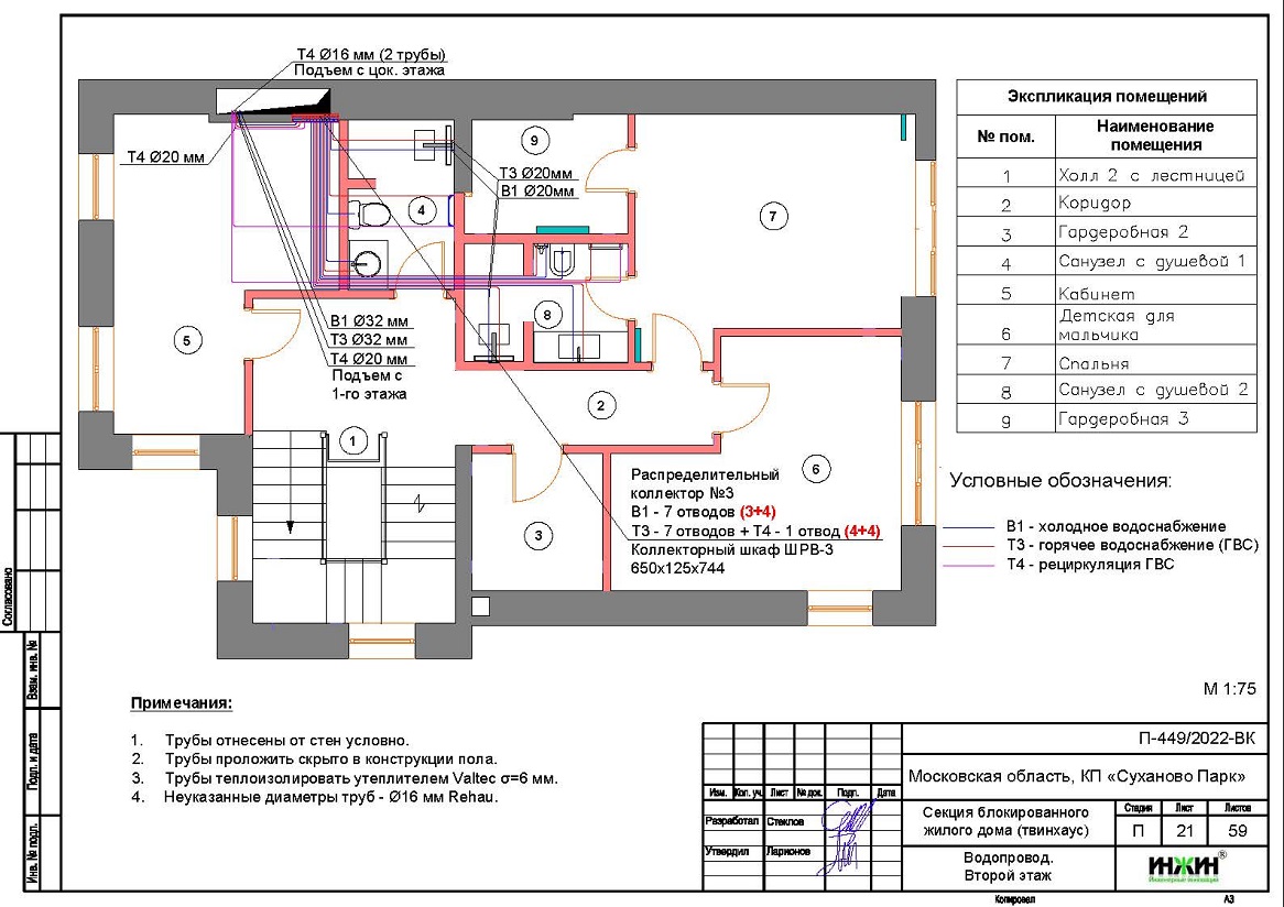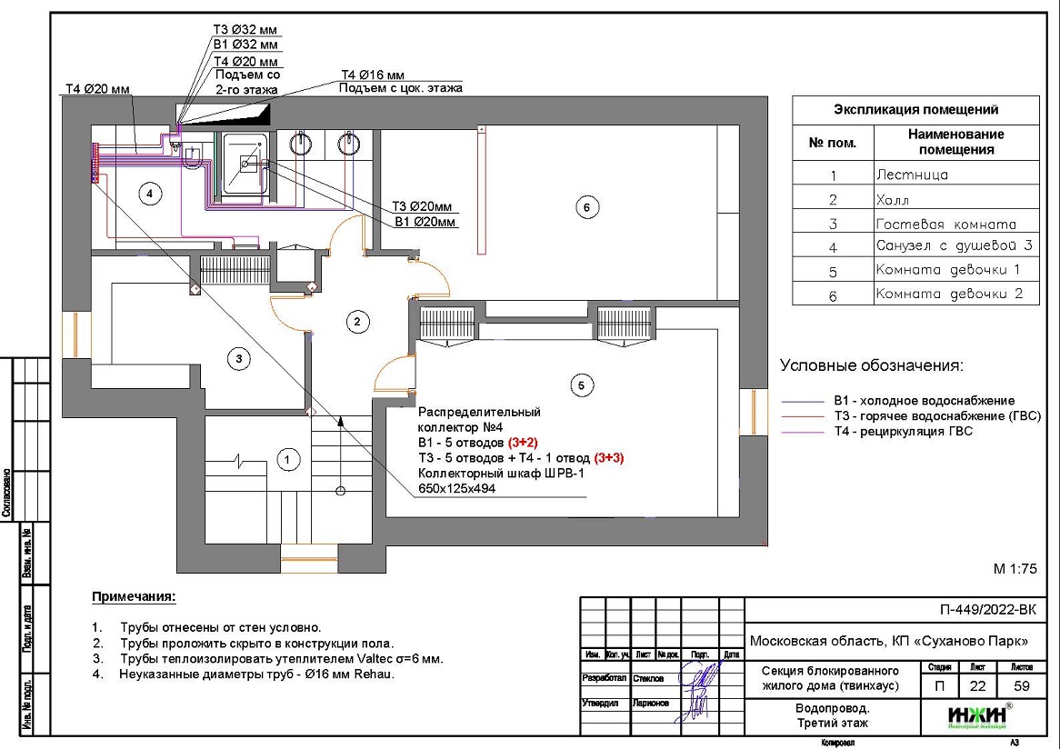 o Схема внутреннего водоснабжения дома – коллекторно-лучевая с рециркуляцией горячей воды через полотенцесушители, выполнен расчет 49-и точек водоснабжения и полотенцесушителей;