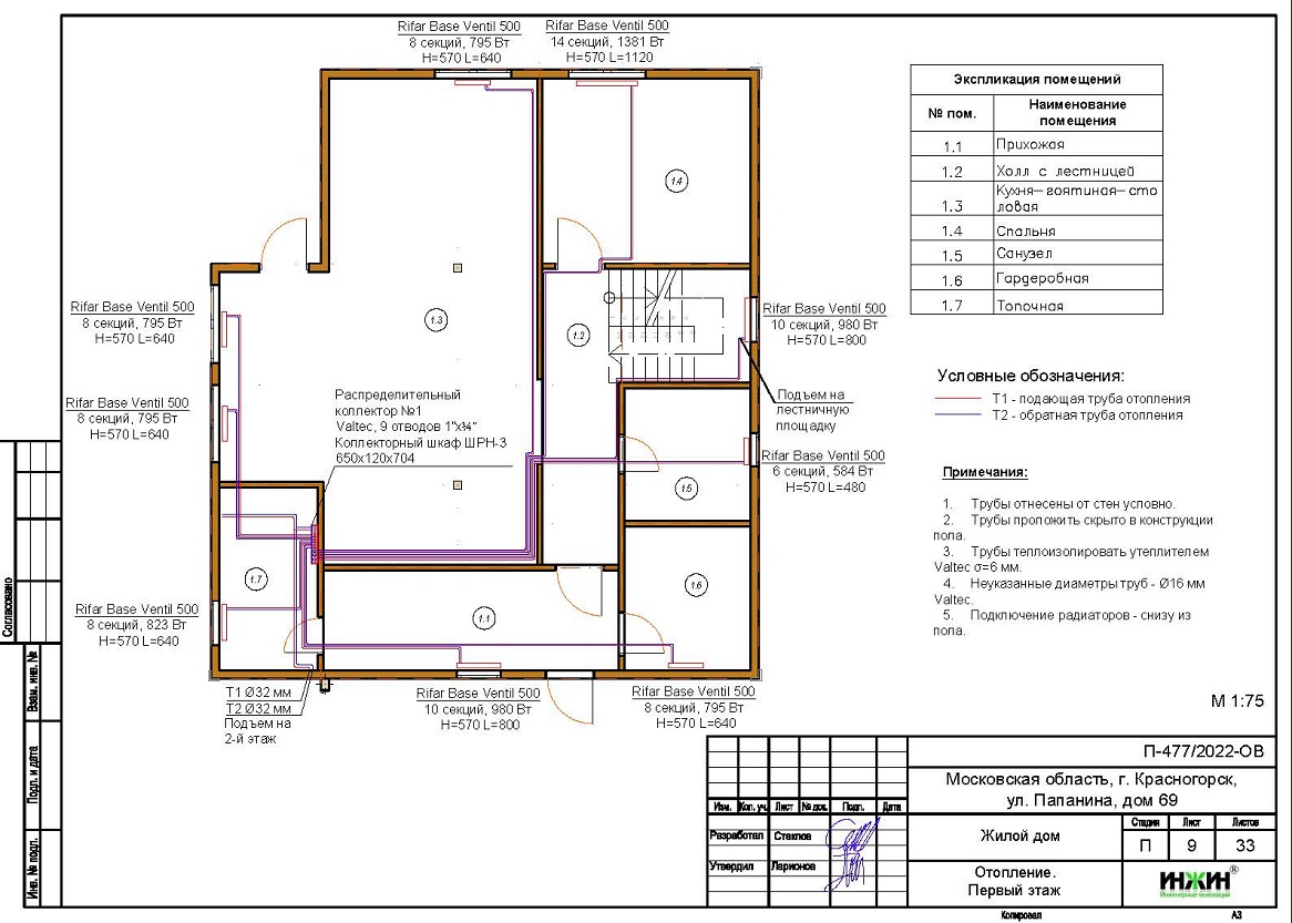 Объем проекта отопления дома в Красногорске: 33 листа.