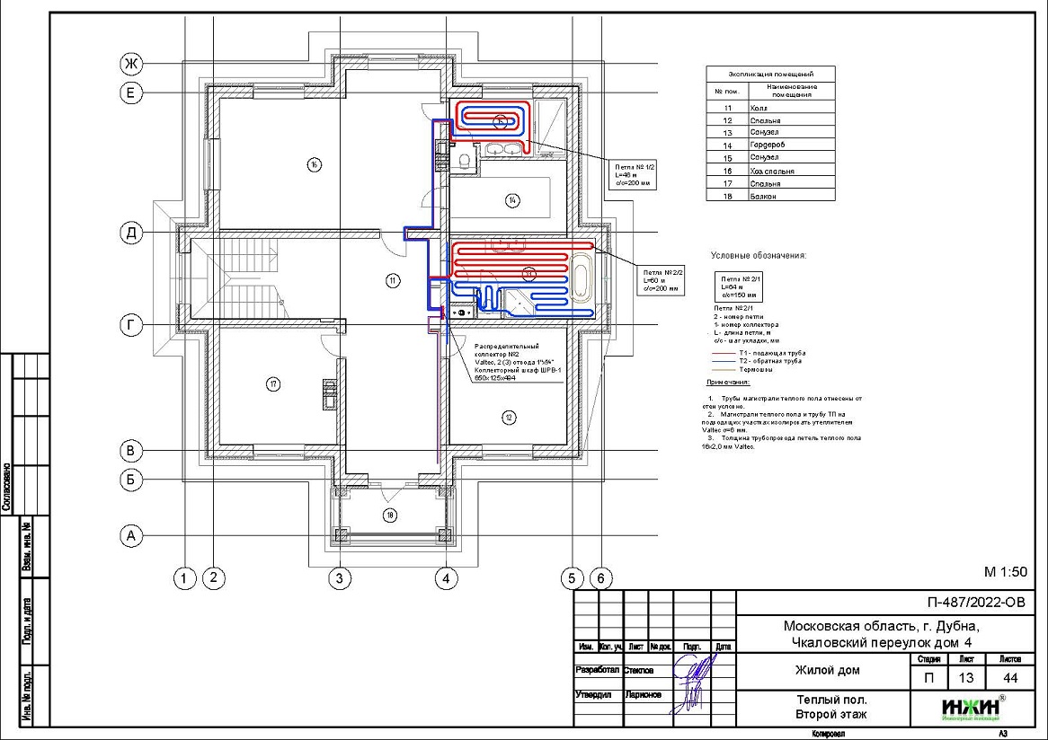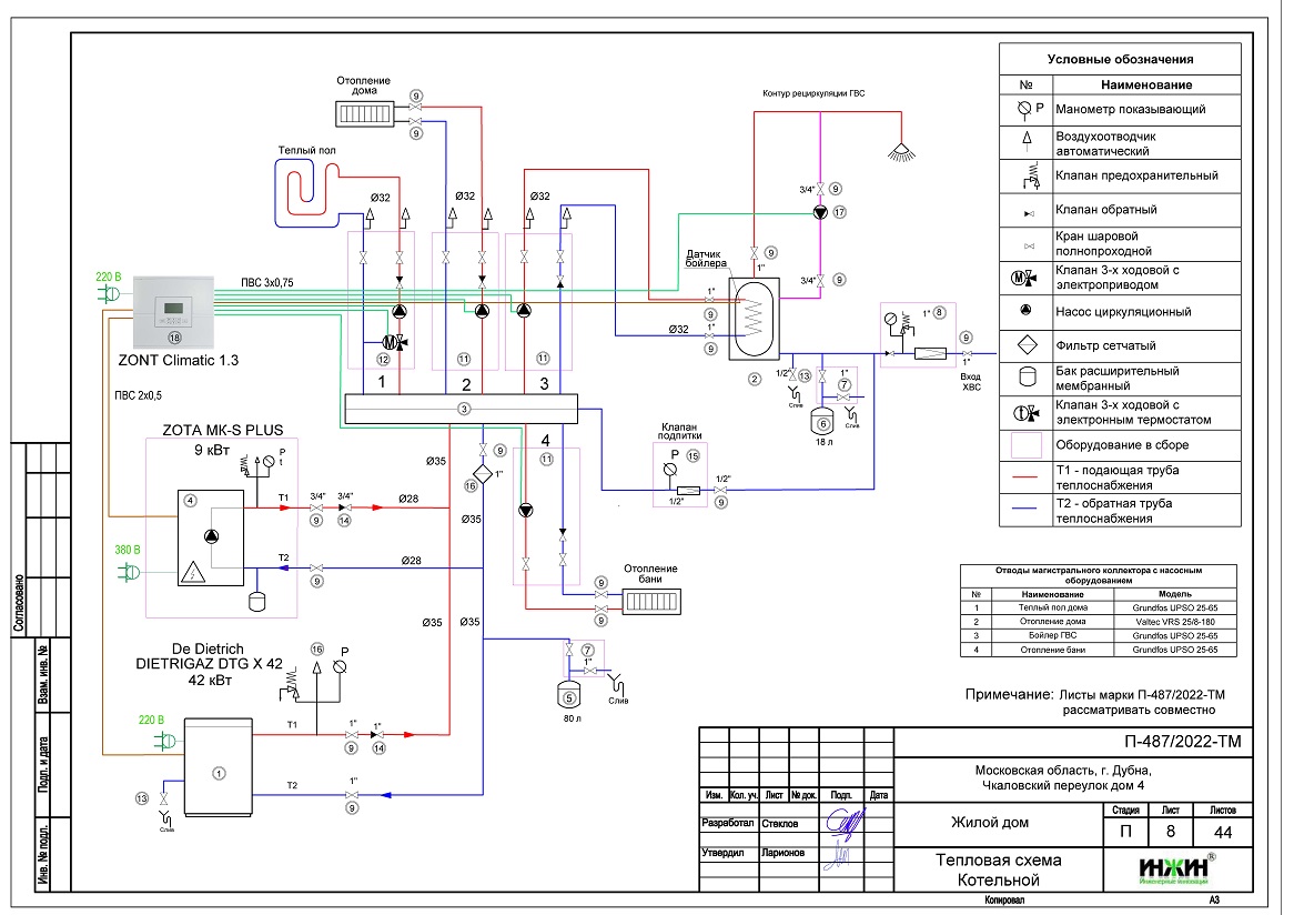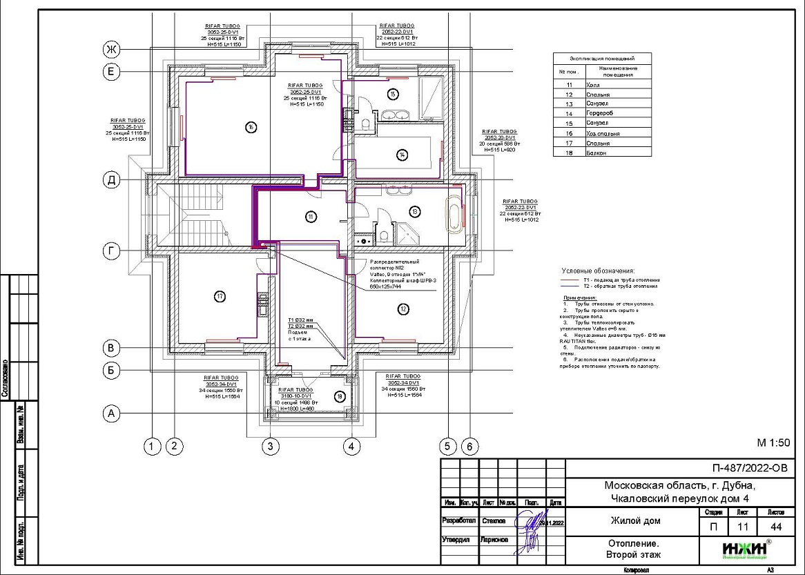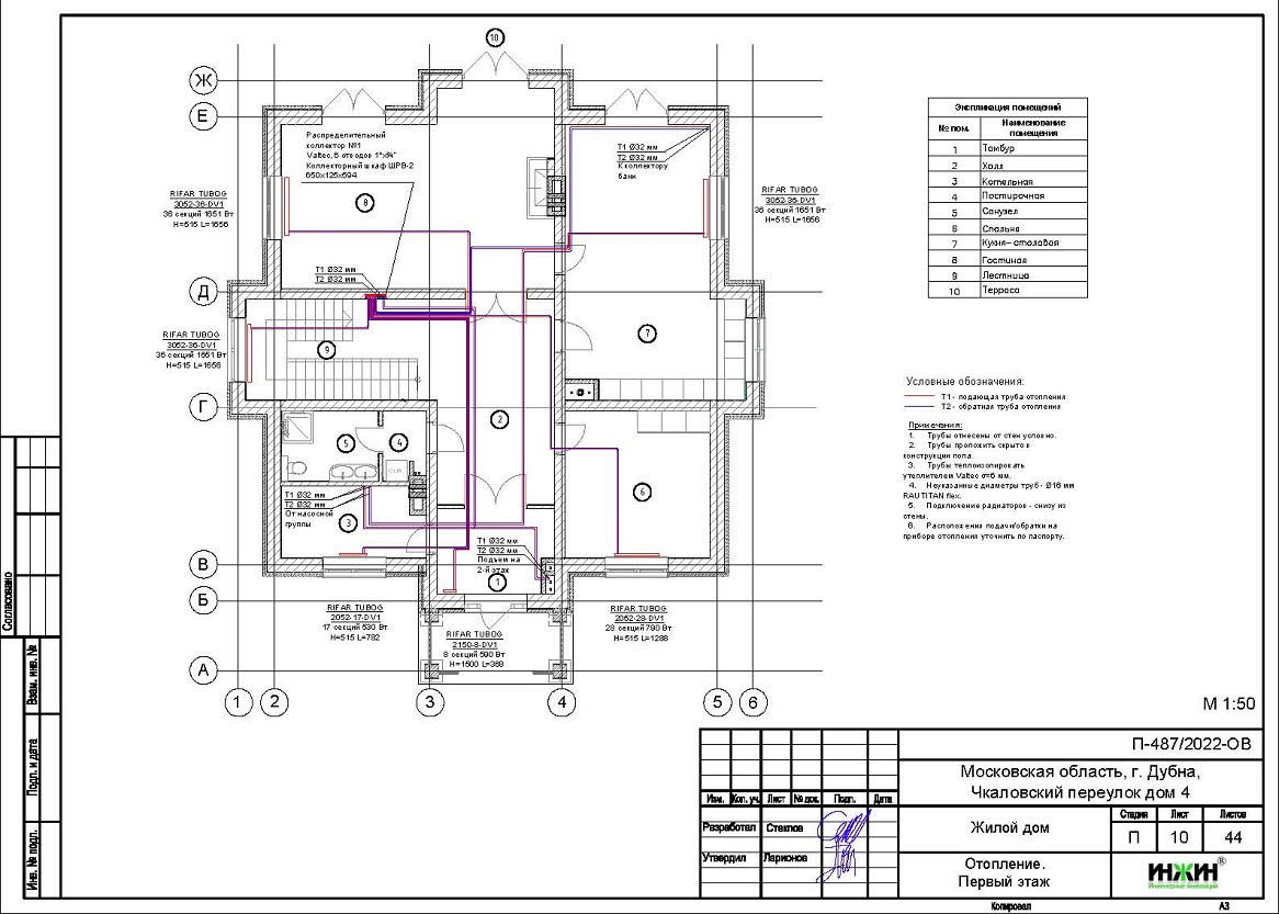Объем проекта отопления, канализации и водоснабжения дома в г. Дубна: 44 листа.